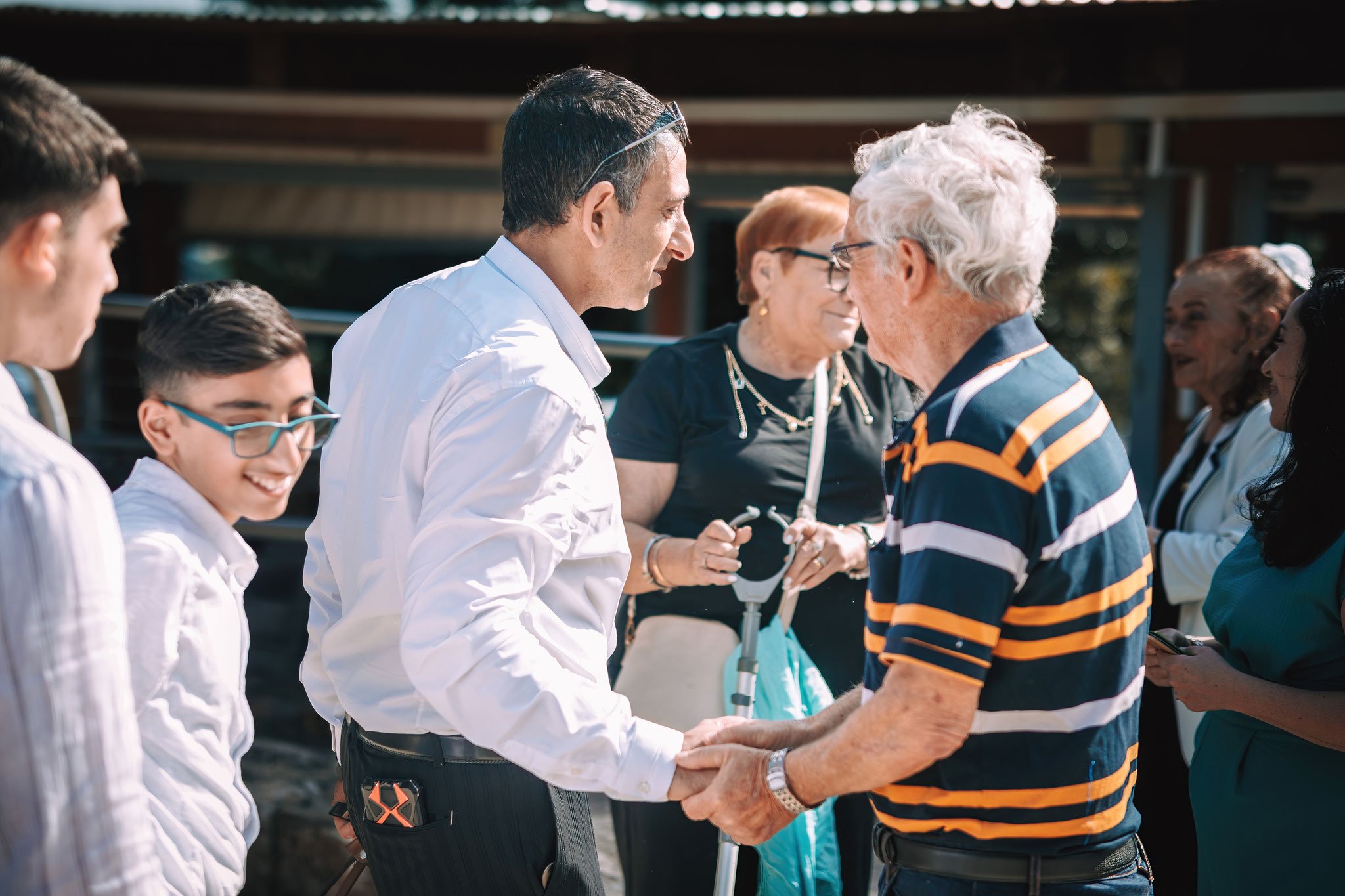 האנרגיות ממשיכות לעלות כשאורחים נוספים מגיעים ומברכים את חתן הבר מצווה. דודים ודודות מחבקים אותו, והוא נראה כמו מישהו שהגיע לרגע המיוחל בחייו. הרגעים האלה, כשהם מחובקים יחד, יוצרים תחושת קהילתיות חמימה ומלכדת