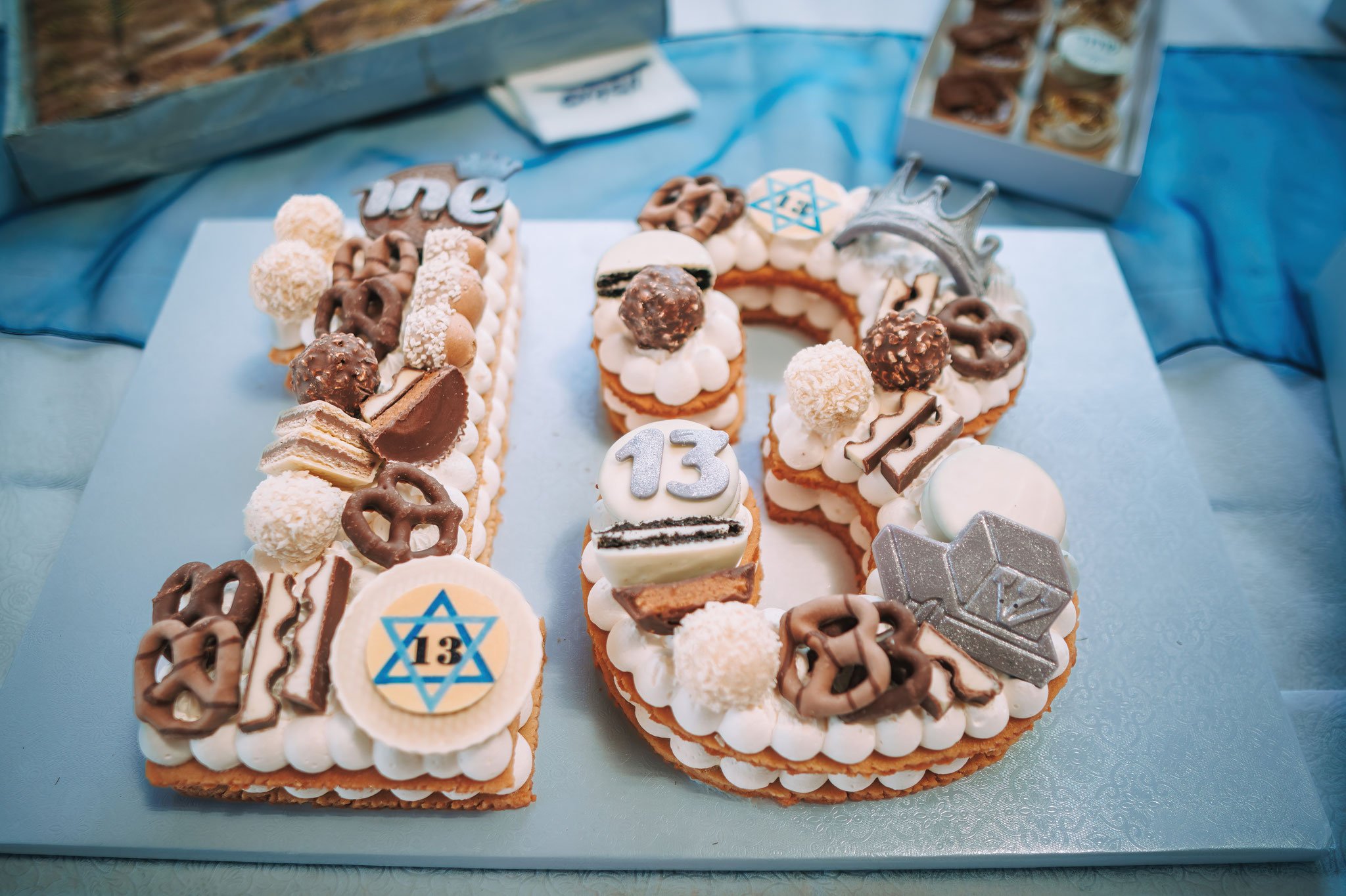 שולחן המתוקים שהוכן לכבוד הבר מצווה מלא בפינוקים קטנים ומתוקים – עוגיות מקרונים עם כוכב דוד והמספר 13, דונאטס עם הכיתוב "שחר" ושאר קינוחים מעוצבים שכל אחד מהם הוא יצירת אומנות קטנה. כל זאת מוכיחים שוב שביום כזה הכל אפשרי