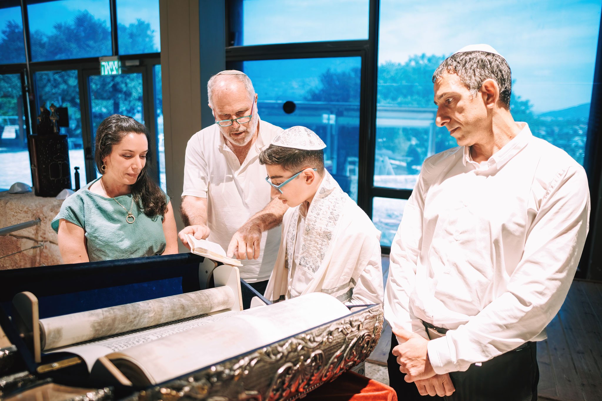 מבט מקרוב על ספר התורה, כשהוא פתוח ומוכן לקריאה. האמא והבן מטושטשים ברקע, מה שמקנה לספר התורה את כל הכבוד הראוי לו. ברקע ניתן לראות את החלונות הגדולים עם הנוף הצפוני המרהיב, אולי כדי שהשכנים לא ירגישו מקופחים כשהם שומעים את הקריאה המרגשת הזו