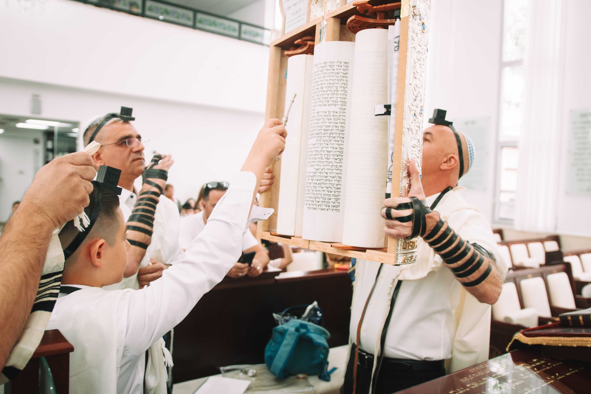 הוצאת ספר התורה וזמן ההגבהה אולי הם הרגעים הבודדים בבית הכנסת בו אפשר להביע את השמחה על ידי זריקת הסוכריות. מצלם אני את החברים זורקים סוכריות על חברם ואת הסבא הגאה מגביה את הספר הקדוש. בצילום מסוג זה חשוב לתפוס גם את האותיות בספר ומקדיש אני תשומת לב בפוקוס על אותה "אצבע" מעוטרת המסמנת היכן מתחילים לקרוא