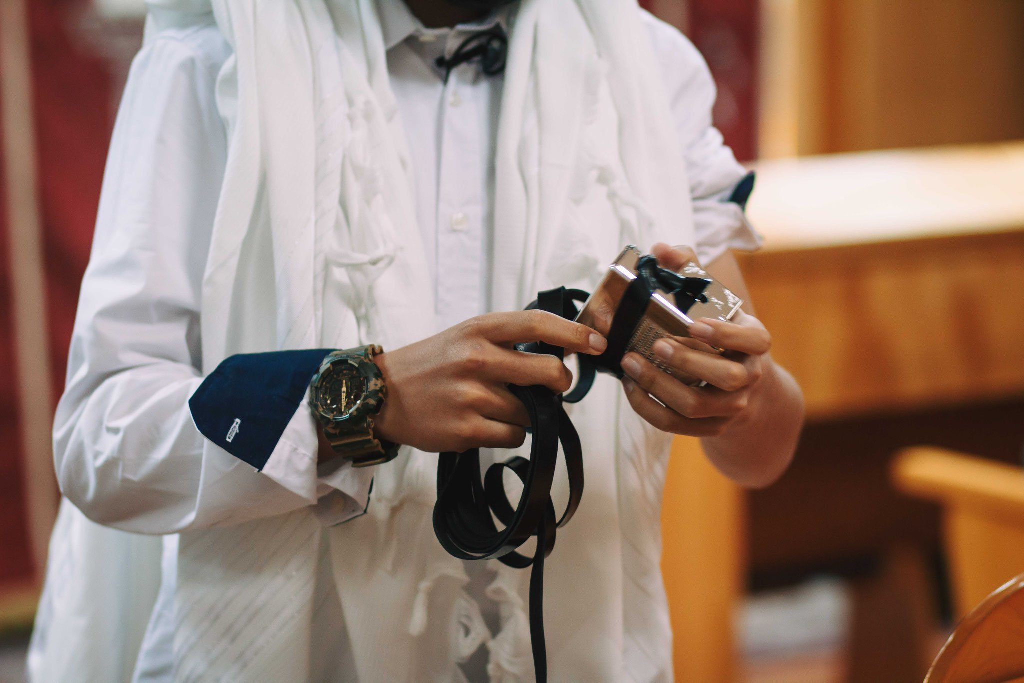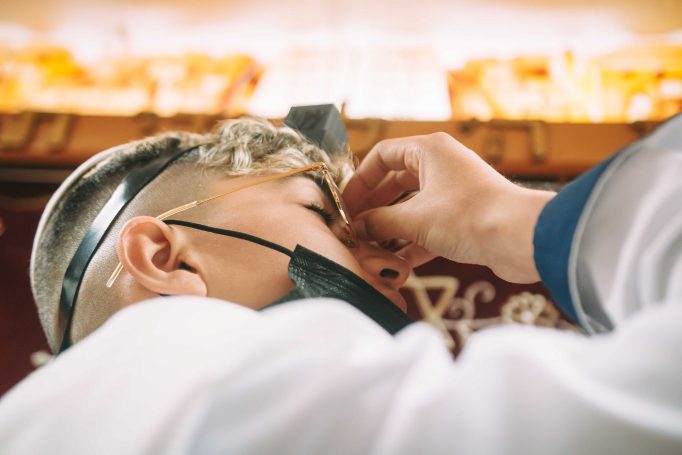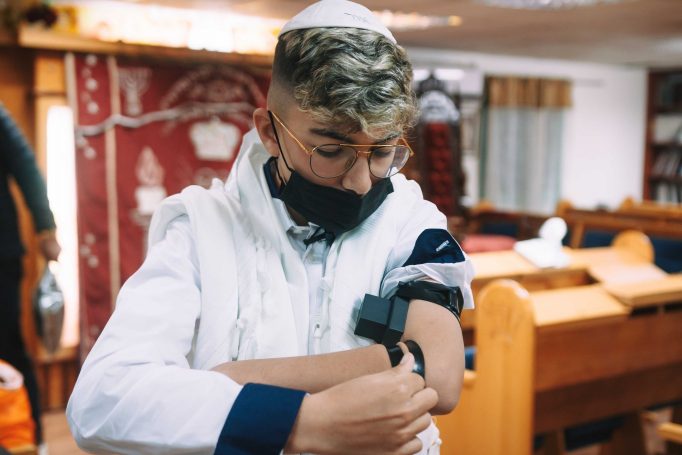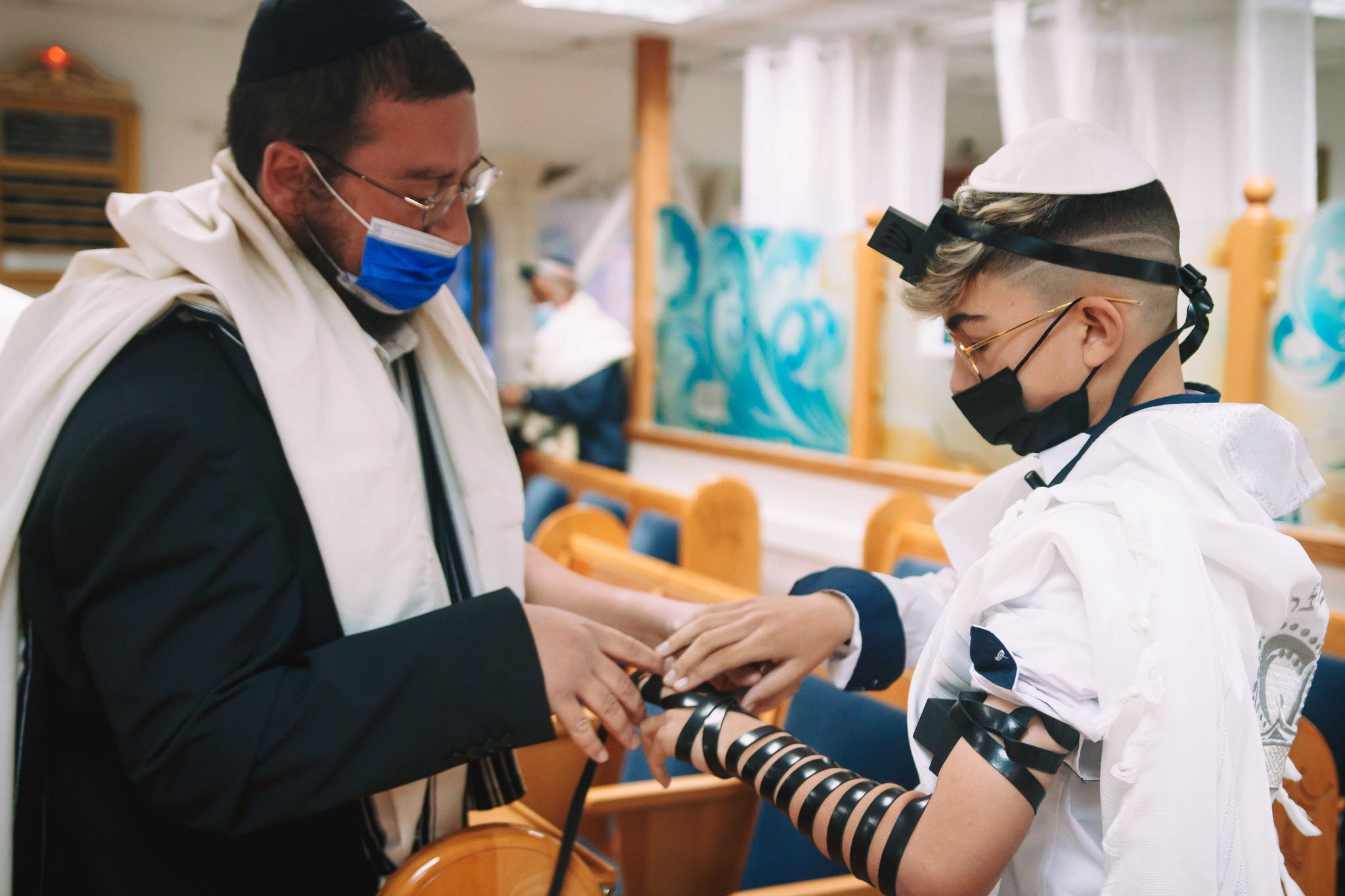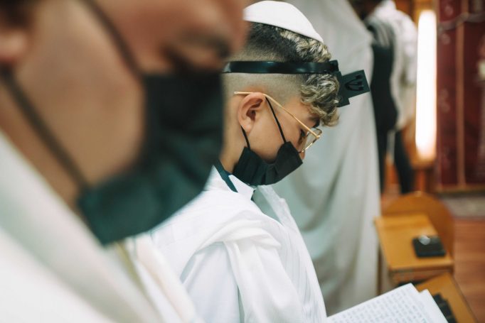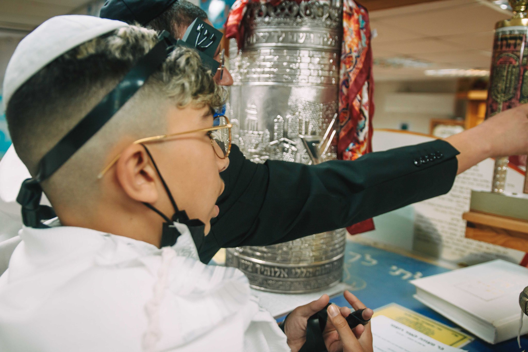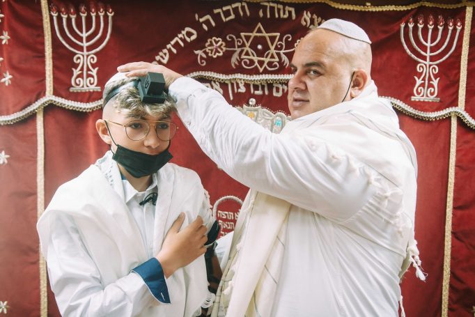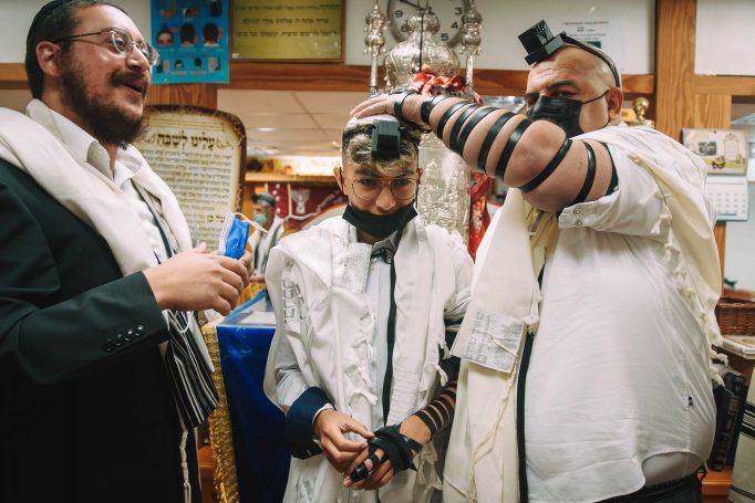 ונחזור לתמונות שמשם הכול מתחיל בעצם: חתן בר המצווה אוחז בבית תפילין של יד כשהוא עם הגבאי בבית הכנסת ועם אביו ומתחילים בהנחת התפילין. תמונה מרגשת מאוד נוספת: הנער שם את התפילין של יד ומברך כמסכה על פיו בשל הקורונה, ברקע תפסתי את שולחנות המתפללים בבית הכנסת. תמונה מאוד מיוחדת נוספת, בחרתי לצלם ממש מקרוב איך הנער מסדר את התפילין של יד על האצבע. אור מדקדק בפרטים הקטנים, חשוב לו לעשות בצורה מושלמת את אשר שקד ולמד