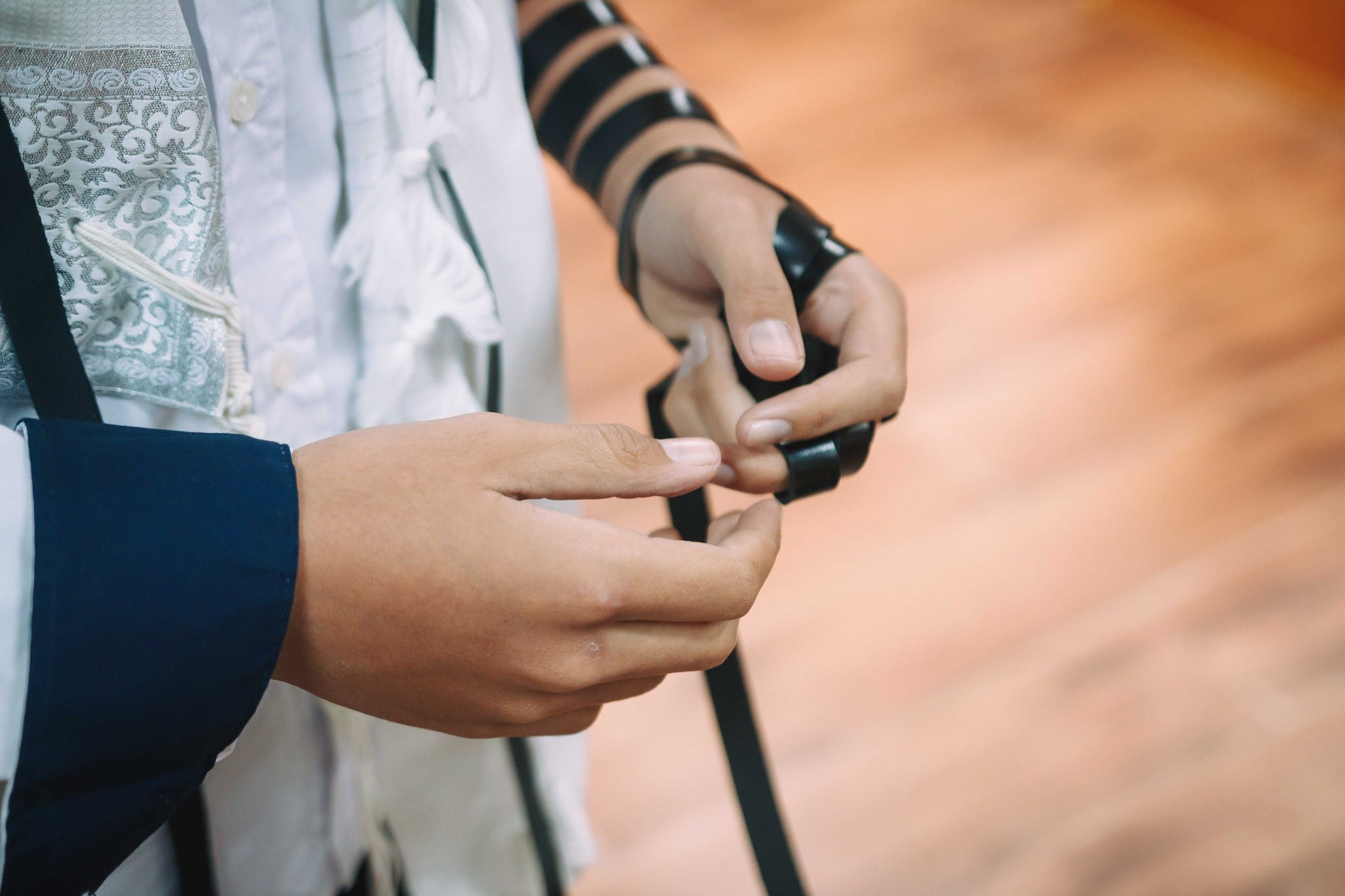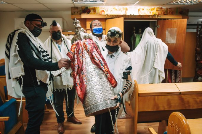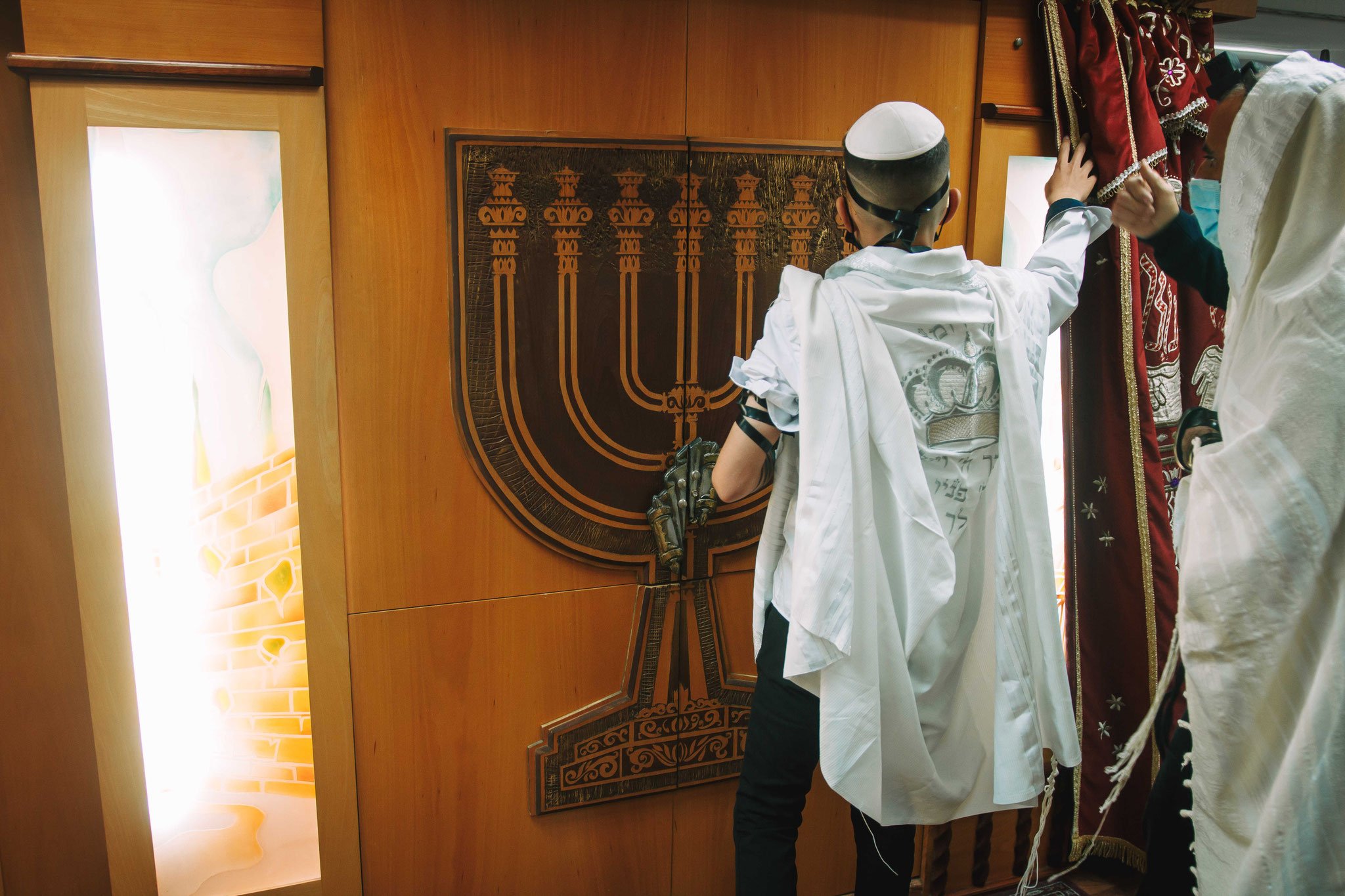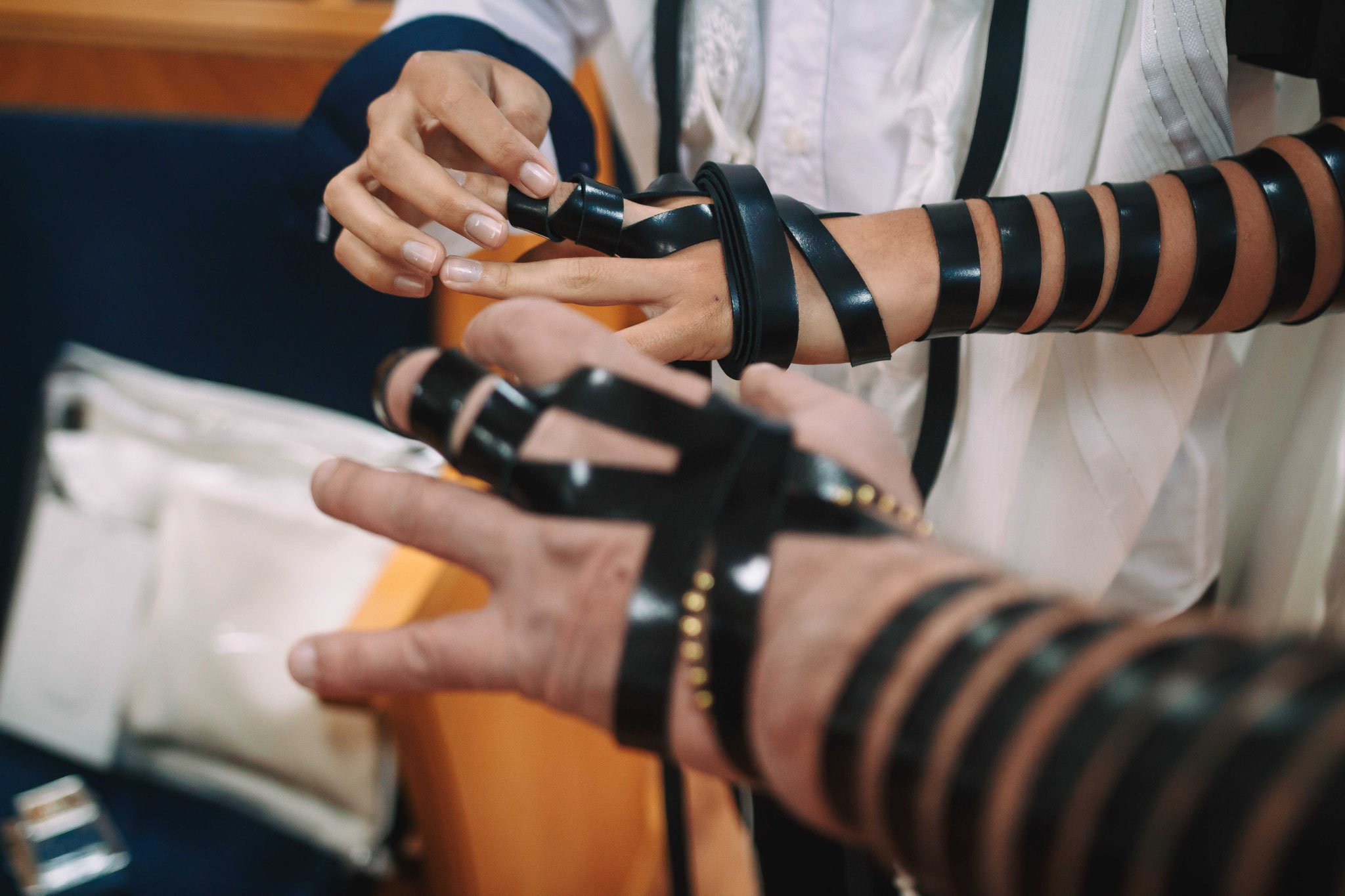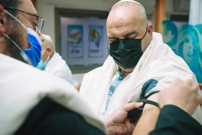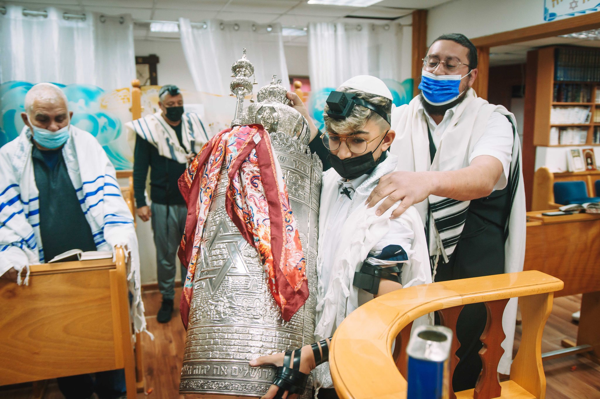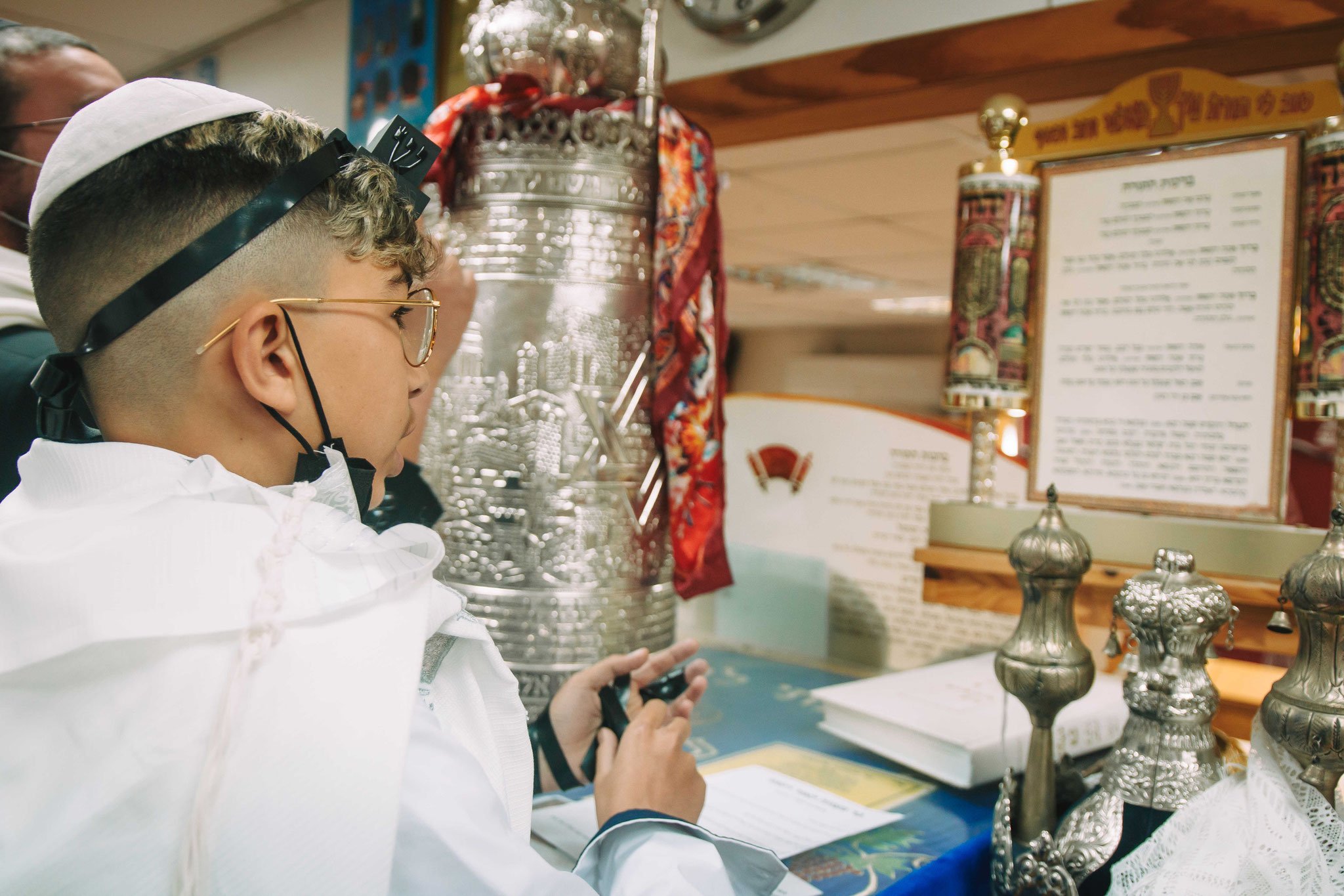 ונחזור לתמונות שמשם הכול מתחיל בעצם: חתן בר המצווה אוחז בבית תפילין של יד כשהוא עם הגבאי בבית הכנסת ועם אביו ומתחילים בהנחת התפילין. תמונה מרגשת מאוד נוספת: הנער שם את התפילין של יד ומברך כמסכה על פיו בשל הקורונה, ברקע תפסתי את שולחנות המתפללים בבית הכנסת. תמונה מאוד מיוחדת נוספת, בחרתי לצלם ממש מקרוב איך הנער מסדר את התפילין של יד על האצבע. אור מדקדק בפרטים הקטנים, חשוב לו לעשות בצורה מושלמת את אשר שקד ולמד
