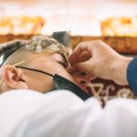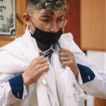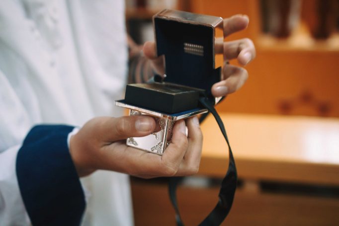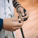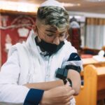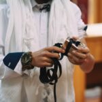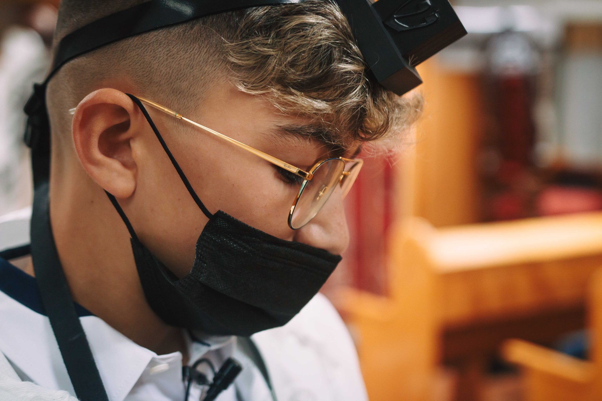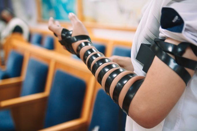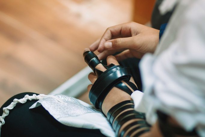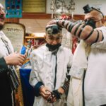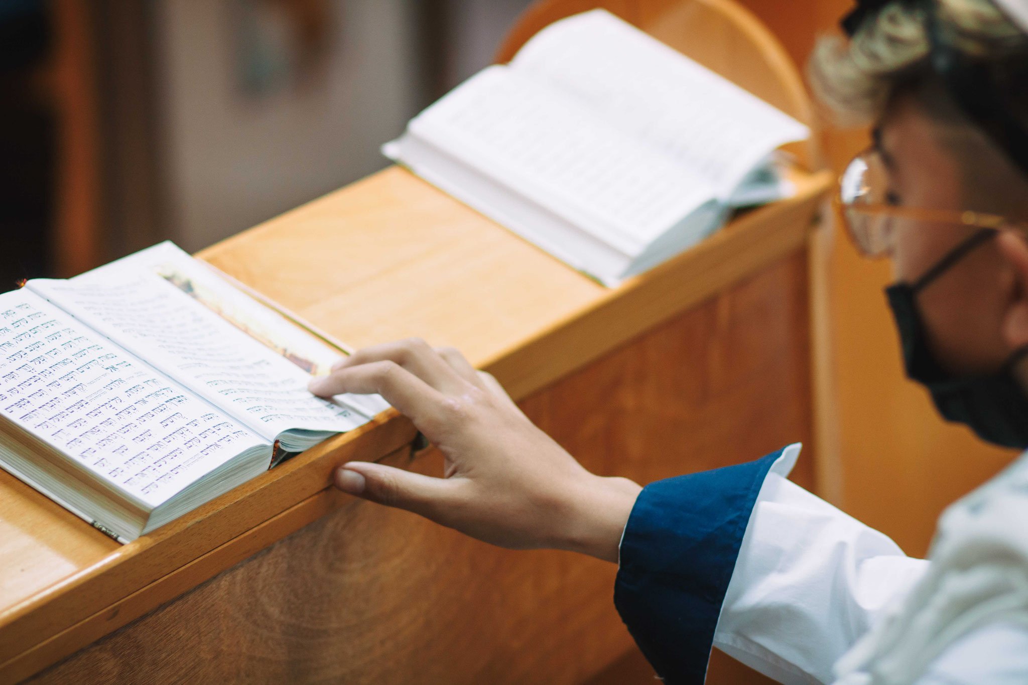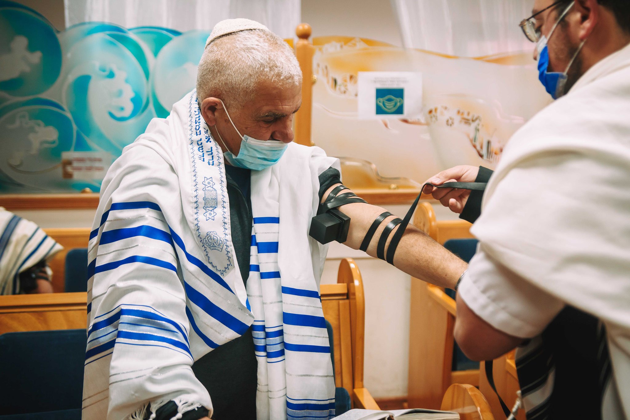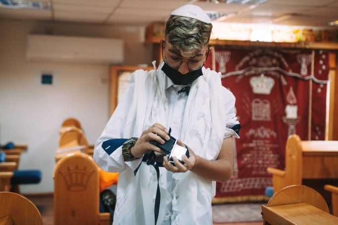 ונחזור לתמונות שמשם הכול מתחיל בעצם: חתן בר המצווה אוחז בבית תפילין של יד כשהוא עם הגבאי בבית הכנסת ועם אביו ומתחילים בהנחת התפילין. תמונה מרגשת מאוד נוספת: הנער שם את התפילין של יד ומברך כמסכה על פיו בשל הקורונה, ברקע תפסתי את שולחנות המתפללים בבית הכנסת. תמונה מאוד מיוחדת נוספת, בחרתי לצלם ממש מקרוב איך הנער מסדר את התפילין של יד על האצבע. אור מדקדק בפרטים הקטנים, חשוב לו לעשות בצורה מושלמת את אשר שקד ולמד