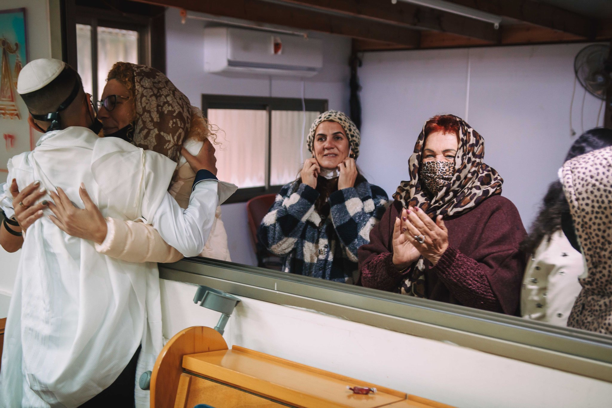 רגע זה נצח ולכן חשוב גם לשמר ולהנציח בתמונות את הנשים בבית הכנסת, צילום רחב התופס את עזרת הנשים, הן עם מסיכות על הפנים, גם הן נשמעות לכללי הקורונה. אך גם עם המסכה ניכר לראות את החיוך והאושר על פניהן ועל עיניהן