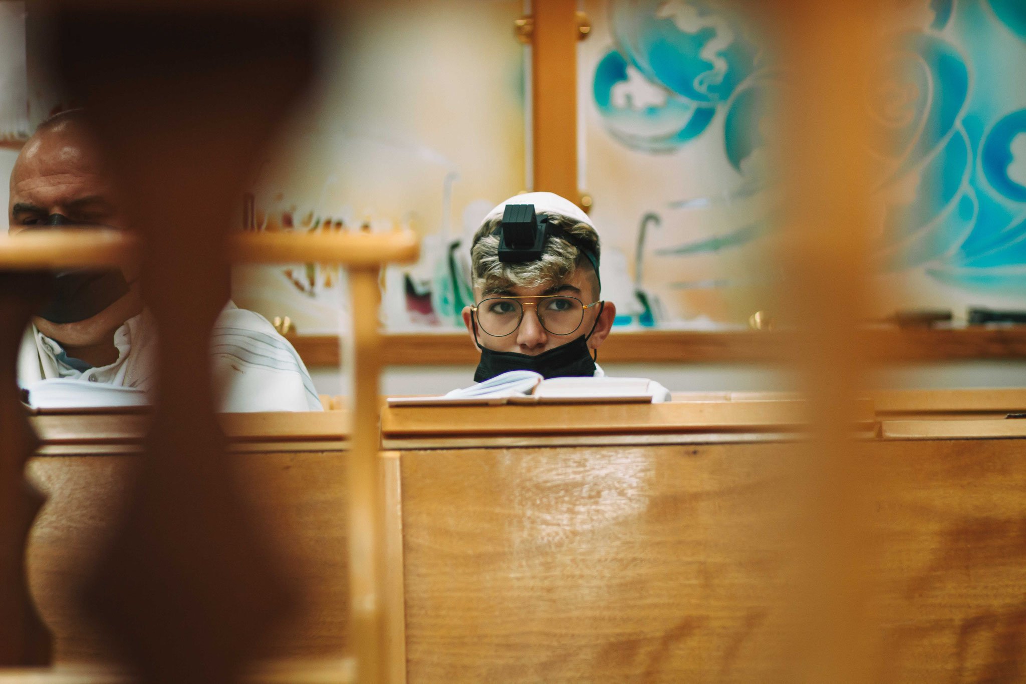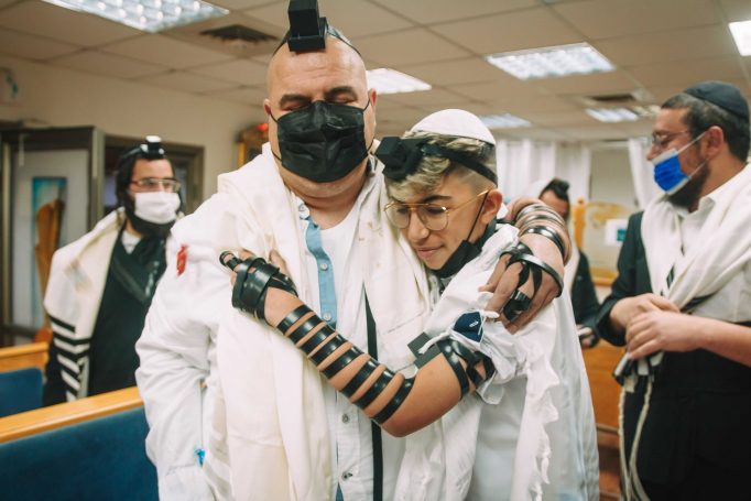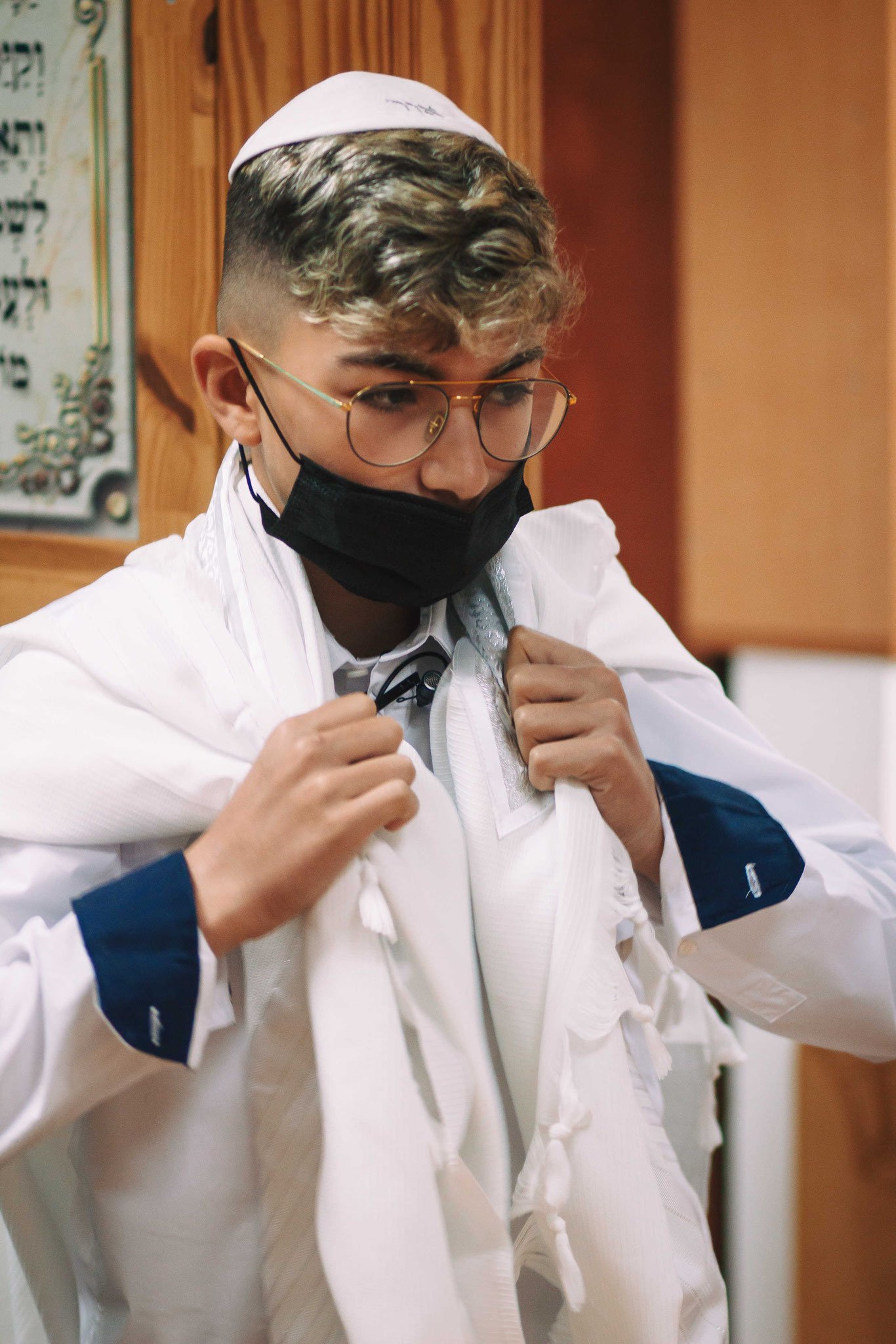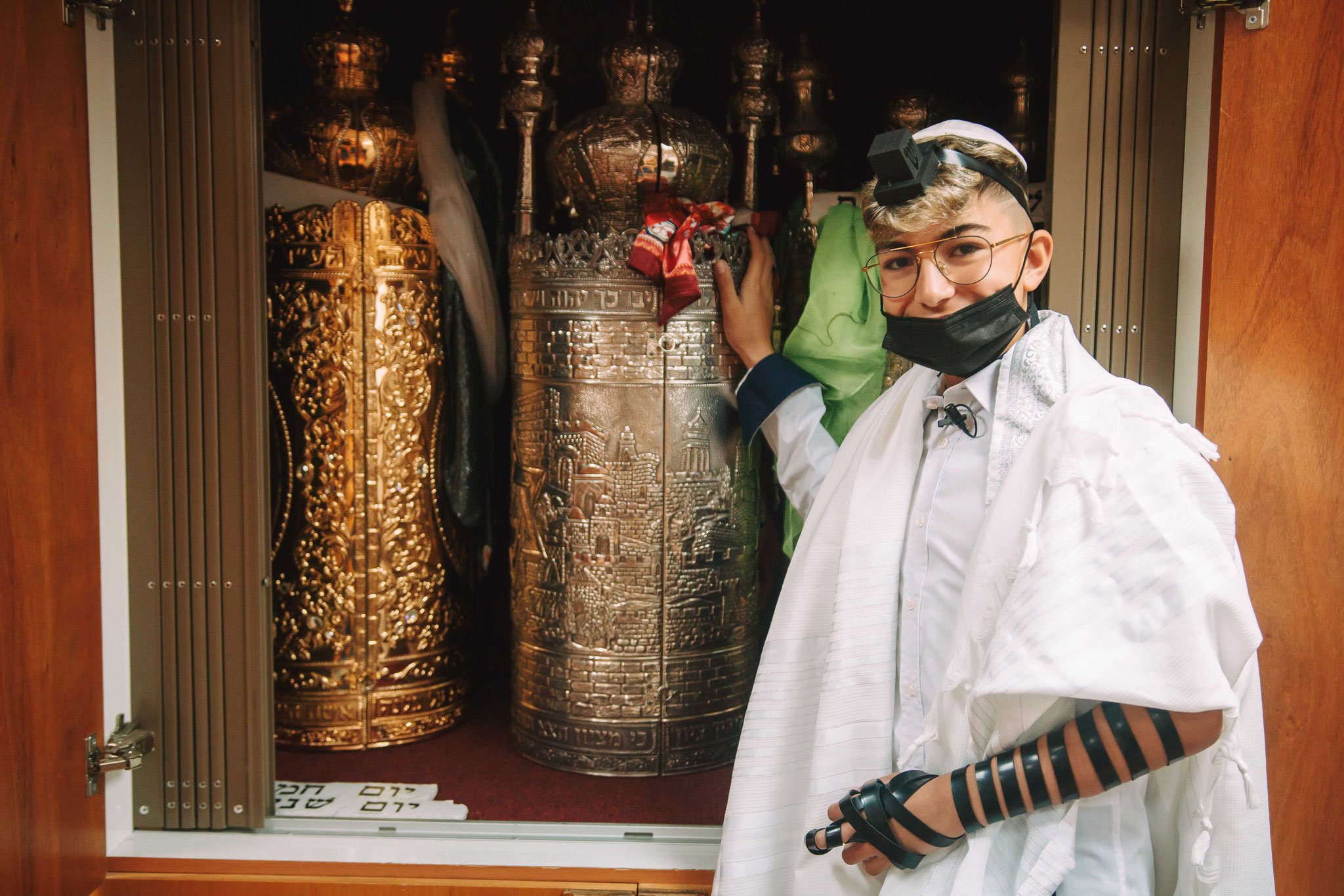 את תחילתו של יום הצילומים בבית הכנסת בחרתי דווקא בתמונה, שהיה קל להכניסה דווקא בהמשך, הנער כבר עם התפילין ואומר שמע ישראל, אך העדפתי שזאת תהיה התמונה הראשונה באלבום בשל ההצהרה החזקה שלה התופסת את מהות כל הטקס. החיבור בין הנער לאמונתו ולאלוקיו ולמורשת משפחתו. הנער מצולם שהוא עם תפילין על ראשו, עטוף בטליתו, ואומר שמע ישאל, ומסיכה על פניו בשל הקורונה. כן! גם בזמן קורונה החיים ממשיכים והנער מפגין את בגרותו ואת חוסנו. זהו צילום תקריב מהצד שהפוקוס על פלג גופו העליון, עם היד על העיניים באמירת השמע, תוך התפיסה ברקע של המשפט שעל ההיכל "שוויתי ה' לנגדי תמיד" שזה מהות ההצהרה של אמירת שמע ישראל