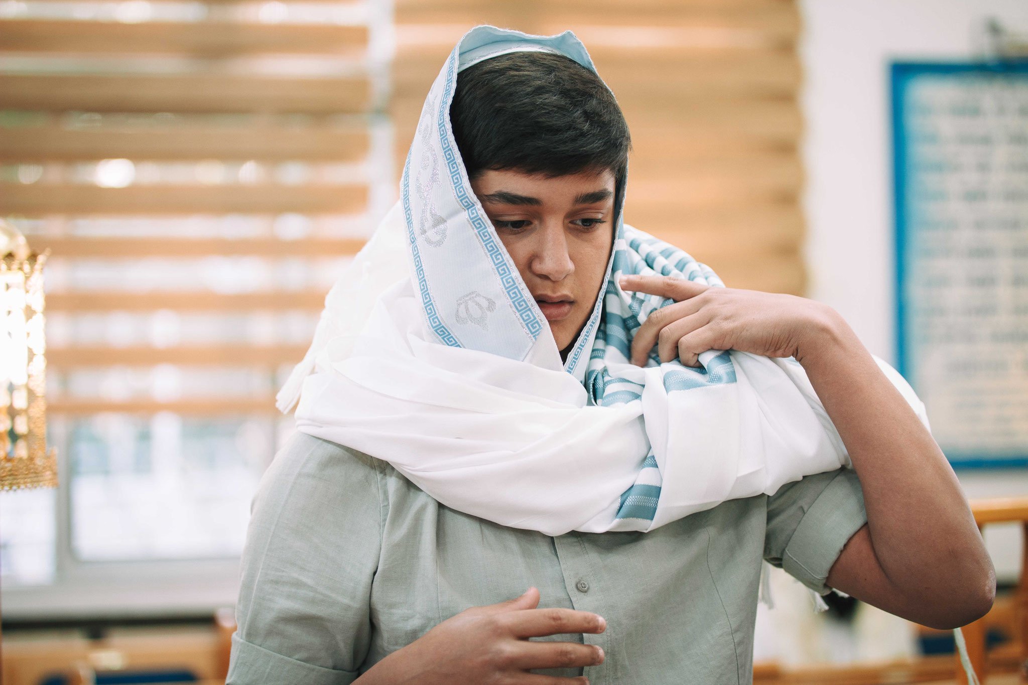 חתן בר המצווה, הלבוש בחליפתו הכחולה החדשה, אחוז בהתרגשות שהוא מתחת לחופת בר המצווה