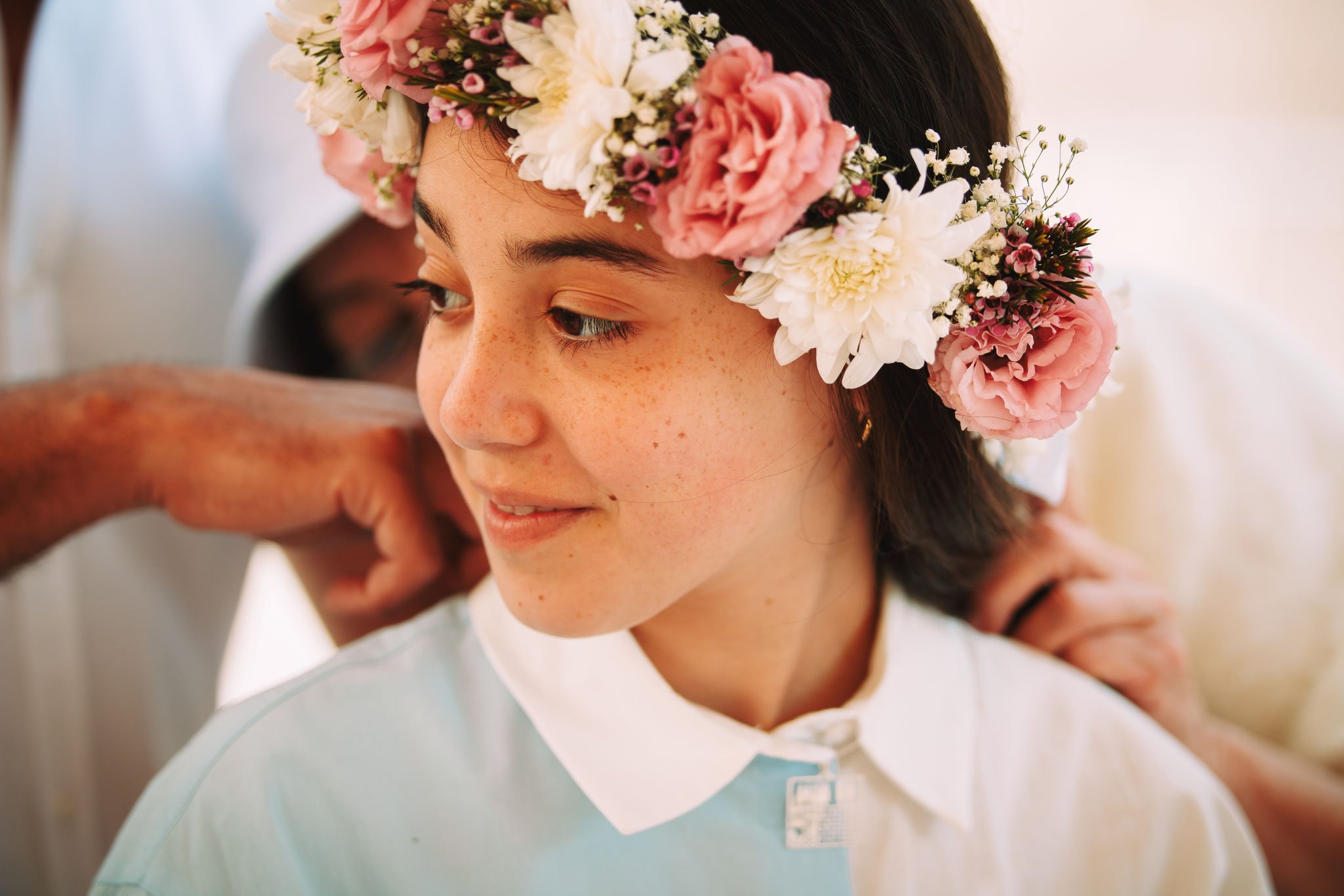 בעזרת ישראל, ברחבת הכותל, נערה חוגגת בת-מצווה. האוויר של ירושלים, אווירה מחשמלת ומרגשת, זה אירוע משמח ומלא גאווה לא רק בעבורה אלא בעבור המשפחה כולה והאורחים. הסבתא מעבירה לנערת השמחה תליון, ואני מצלמה מניחה את התליון על צווארה. בצילום בזום מקרוב מאוד אני בפוקוס על צווארה של בעלת השמחה אני מתמקד בתליון, עדינותו והמרקם המיוחד אשר לו נראים בבירור. והמשכתי לתמונת פרופיל, מתמקד בפלג גוף העליון. כלת בת-המצווה עם ראש מוטה הצידה ואני מצלם מקרוב, זר הפרחים שעל ראשה, המבט בעיניים, התליון אשר על צווארה, גומות החן שעל פניה. יראת הכבוד מהמעמד, הבנת חשיבותו ולא רק את שמחתו. תמונה שמנציחה את הרגע, שמפה תהליך של התבגרות, נשיאת באחריות לדרך, להוות השראה לצעירים יותר