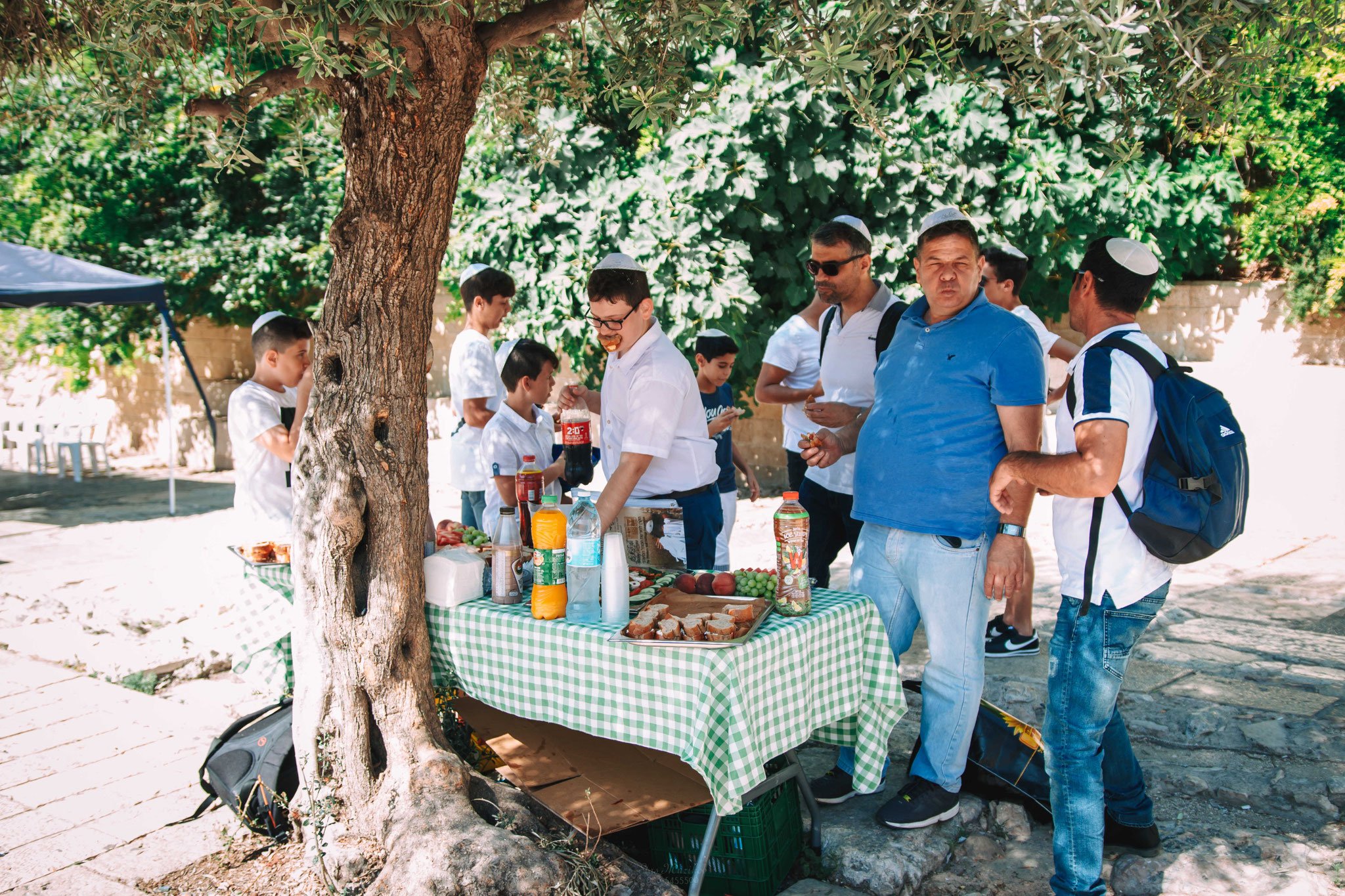 עם סיום חלק זה, ישנה ארוחה קלה, ואין כמו להתוודע אחד לשני ולהתחבר בסמוך לשולחן המלא מכול טוב באוויר הירושלמי. צילום מרוחק התופס את השולחן המכובד ואת המשפחה והאורחים בסמוך לו. וצילום גם שהם עם גבם למצלמה לתעד ולהראות את ההתקהלות המכובדת והחשובה אשר משתתפים ברגע המכונן של חתן בר-המצווה