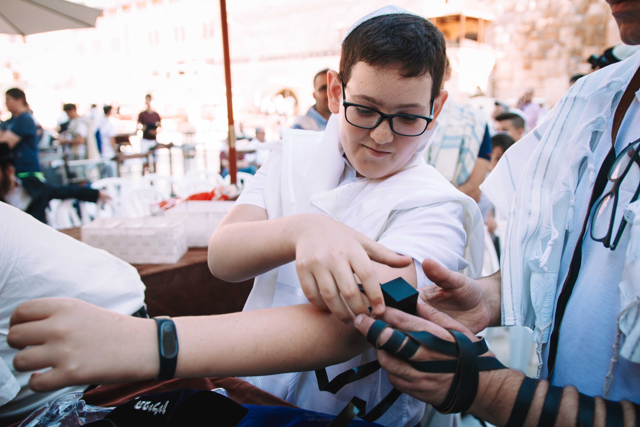 האבא מצולם שידיו שולפות את התפילין מהבית, ואחר כך מצולם הוא עם התפילין וטליתו, מחבק את בנו העטוף בטליתו החדשה, וברקע האבנים הירושלמיות. חתן בר המצווה מהוה דוגמא אישית גם כן לצעירים יותר, ובחרתי לתעד מעזרת הנשים, את אחד התינוקות מחוזק על ידי אימו, מתבונן, המבט הטהור הזה יישאר לנצח מבעד לעיני המצלמה. הנער מניח את התפילין ואין כמו תמונה נהדרת להראות ביום חתונתו ואף לילדיו ונכדיו את החינוך עליו הוא גדל. בתור צלם לבר מצווה במחויבות ובתפיסתי אני מספר סיפור של הנער ובתמונה הבאה האבא עוזר לבנו להניח את התפילין, ואני תופס הכי קרוב שיש אך מבלי להיות מעורב, מבלי להפריע. הריכוז של שניהם באותה המשימה, באותה העשייה והדרך