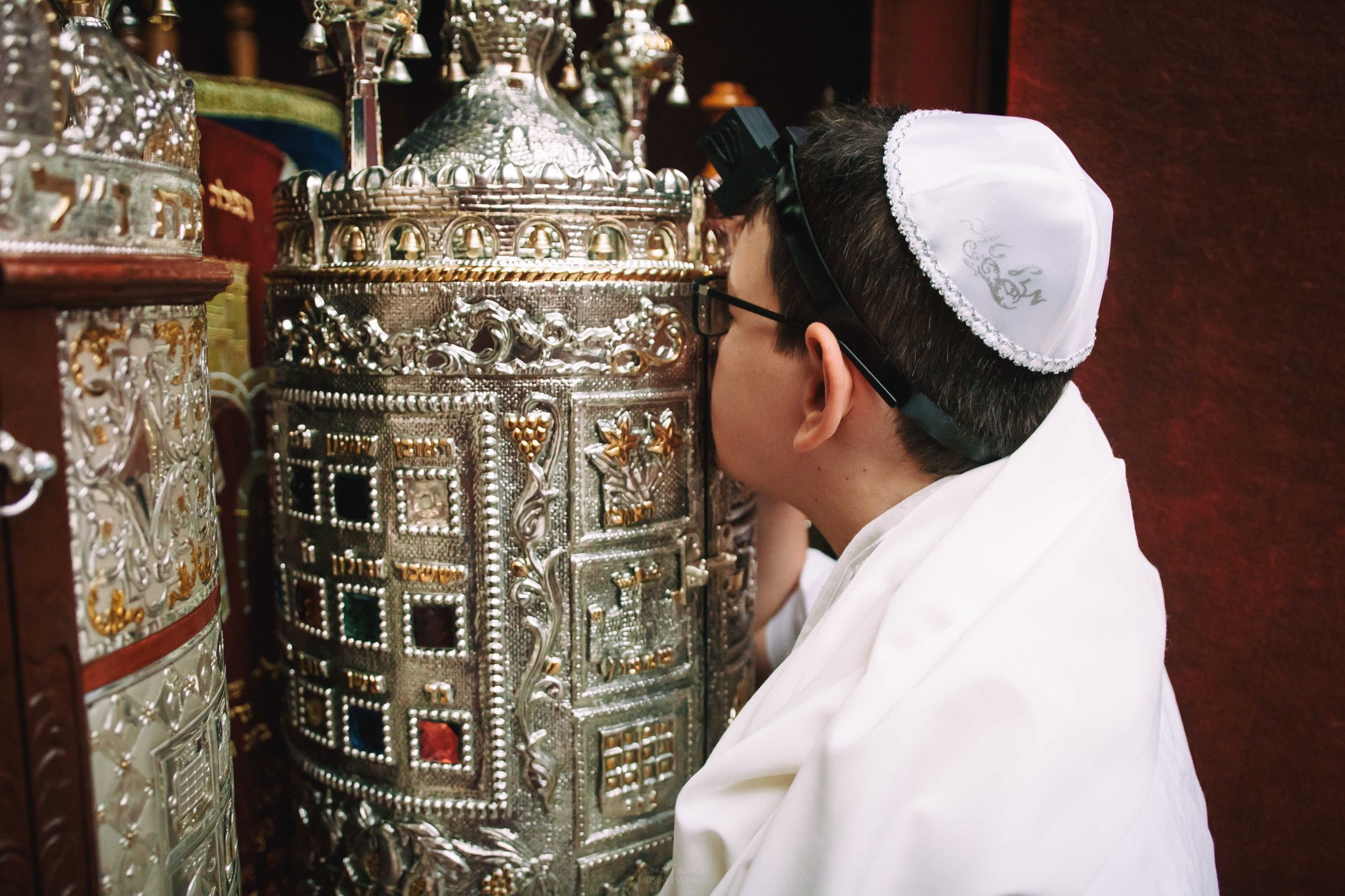 חתן בר המצווה, הלבוש בחליפתו הכחולה החדשה, אחוז בהתרגשות שהוא מתחת לחופת בר המצווה