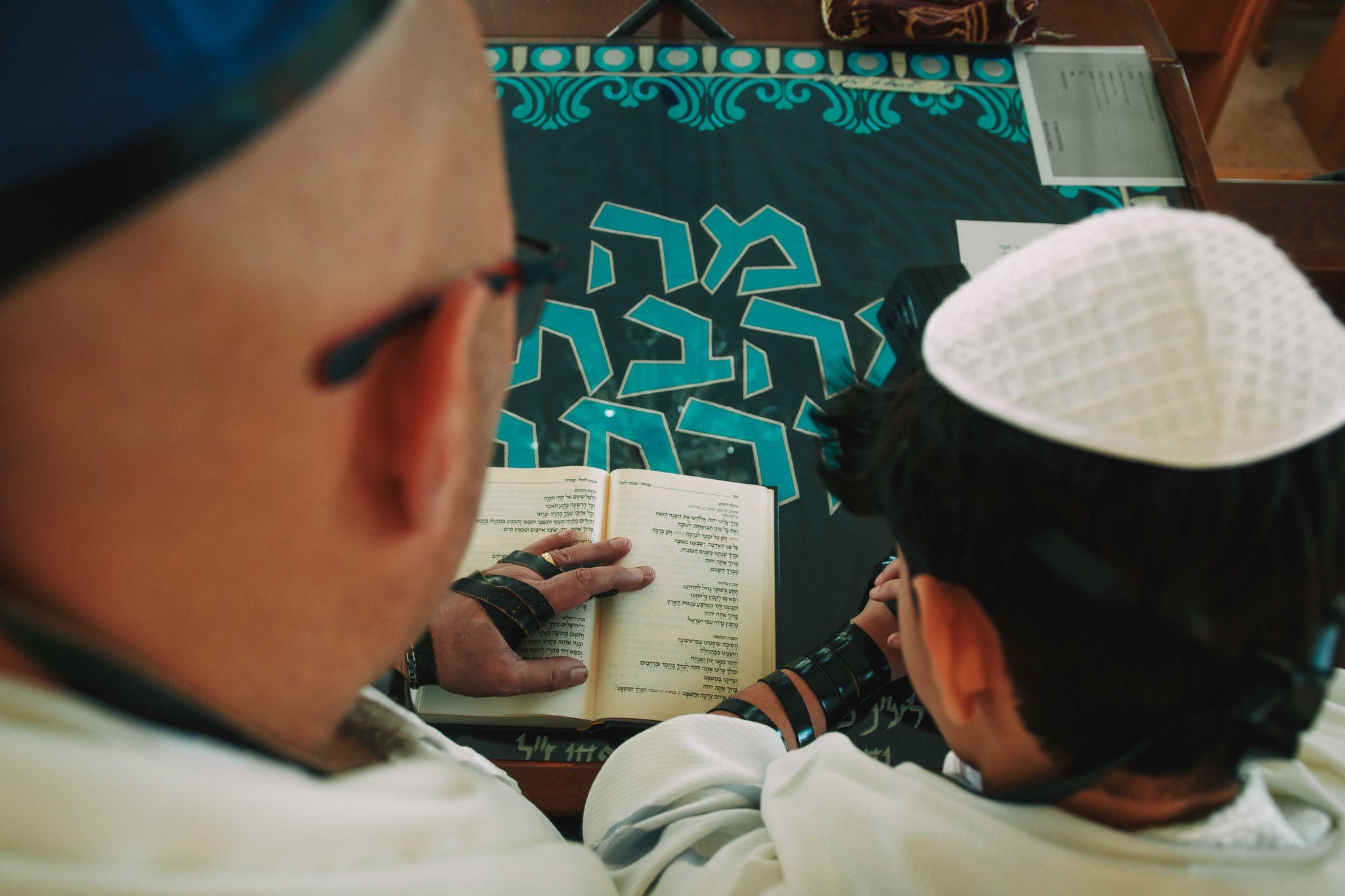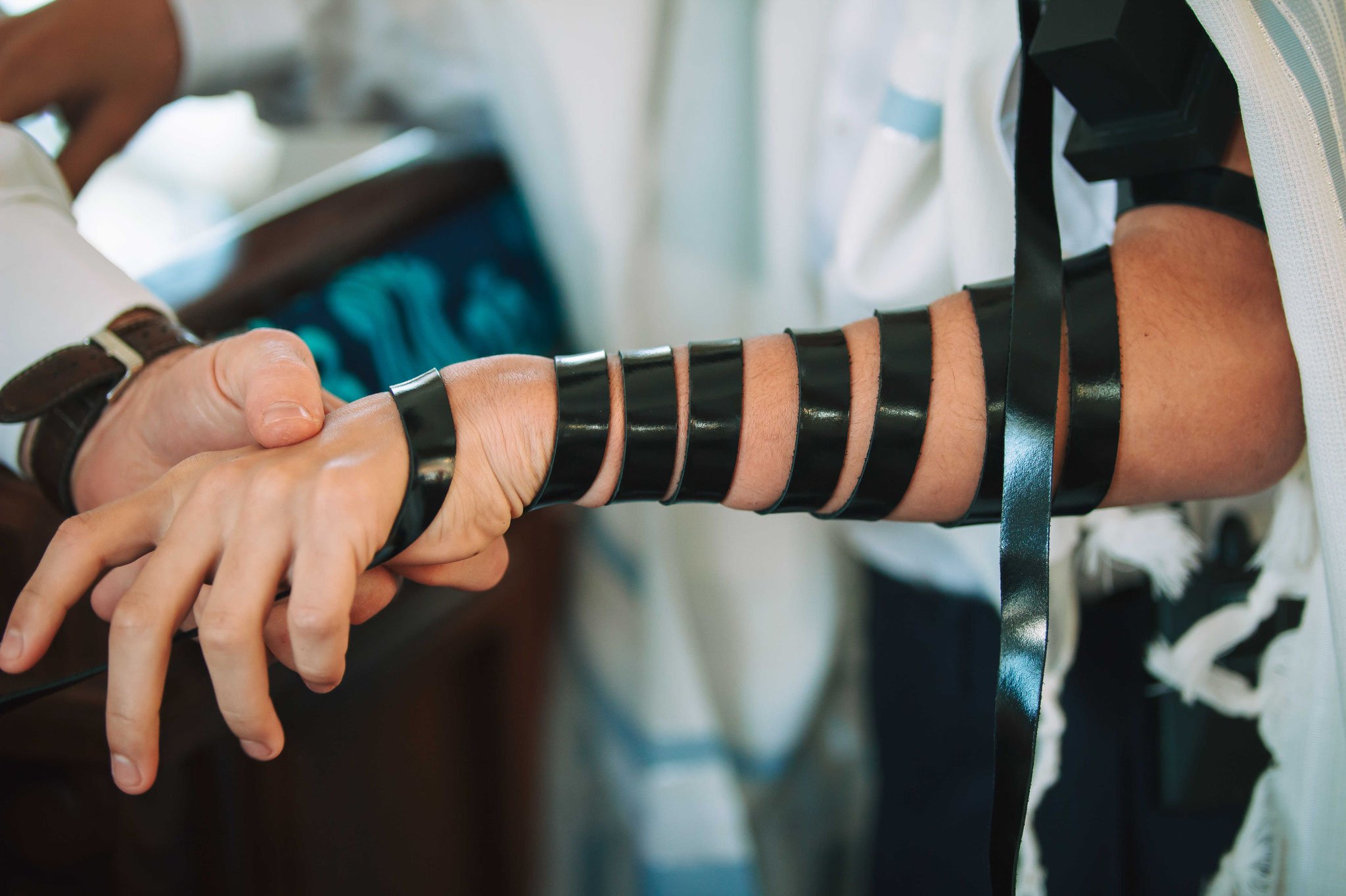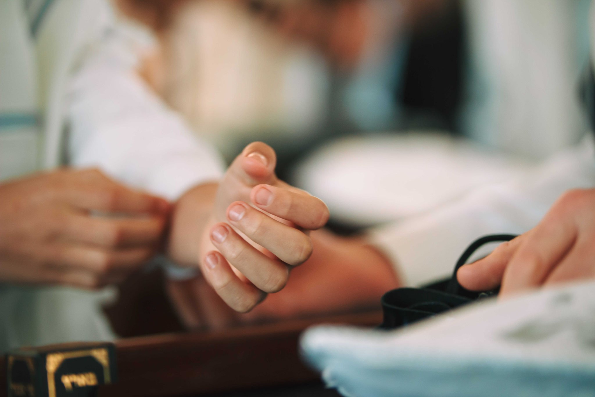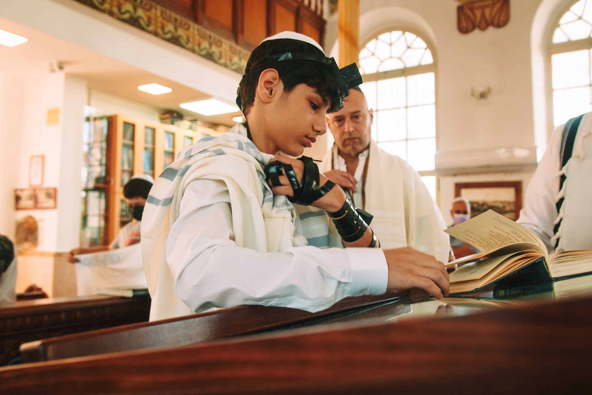 מה אהבתי תורתך רשום על הדוכן של החזן, ואני מצלם מקרוב ומתרחק אחורנית, לתת תחושה של הכתוב ככתוביות המופיעות על המסך, כרקע מקדים לחתן בר-המצווה המתעטף ביראת שמיים, בטליתו החדשה. איזה רגע מכונן זה לצלם את הנער בזמן הנחת התפילין על ידו, רגע שממנו והלאה נחשב הוא למניין ולוקח על עצמו את עול המצוות ולוקח לעצמו את המסורת ודרכו של הסבא הייקר