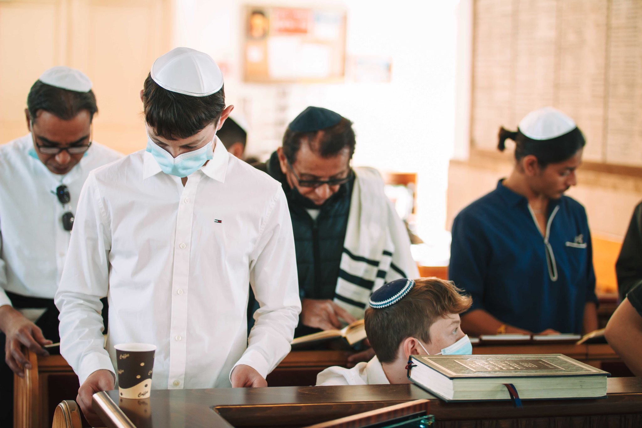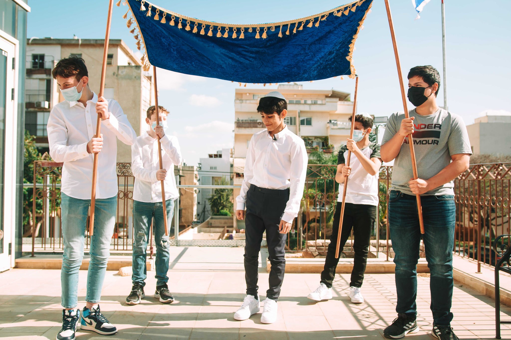 נער בר המצווה עומד ברחבת בית הכנסת מתחת לסככת בר המצווה שלו הנאחזת על ידי ארבעה מחבריו. מלפנים מוסיקאים שתוקעים בשופר