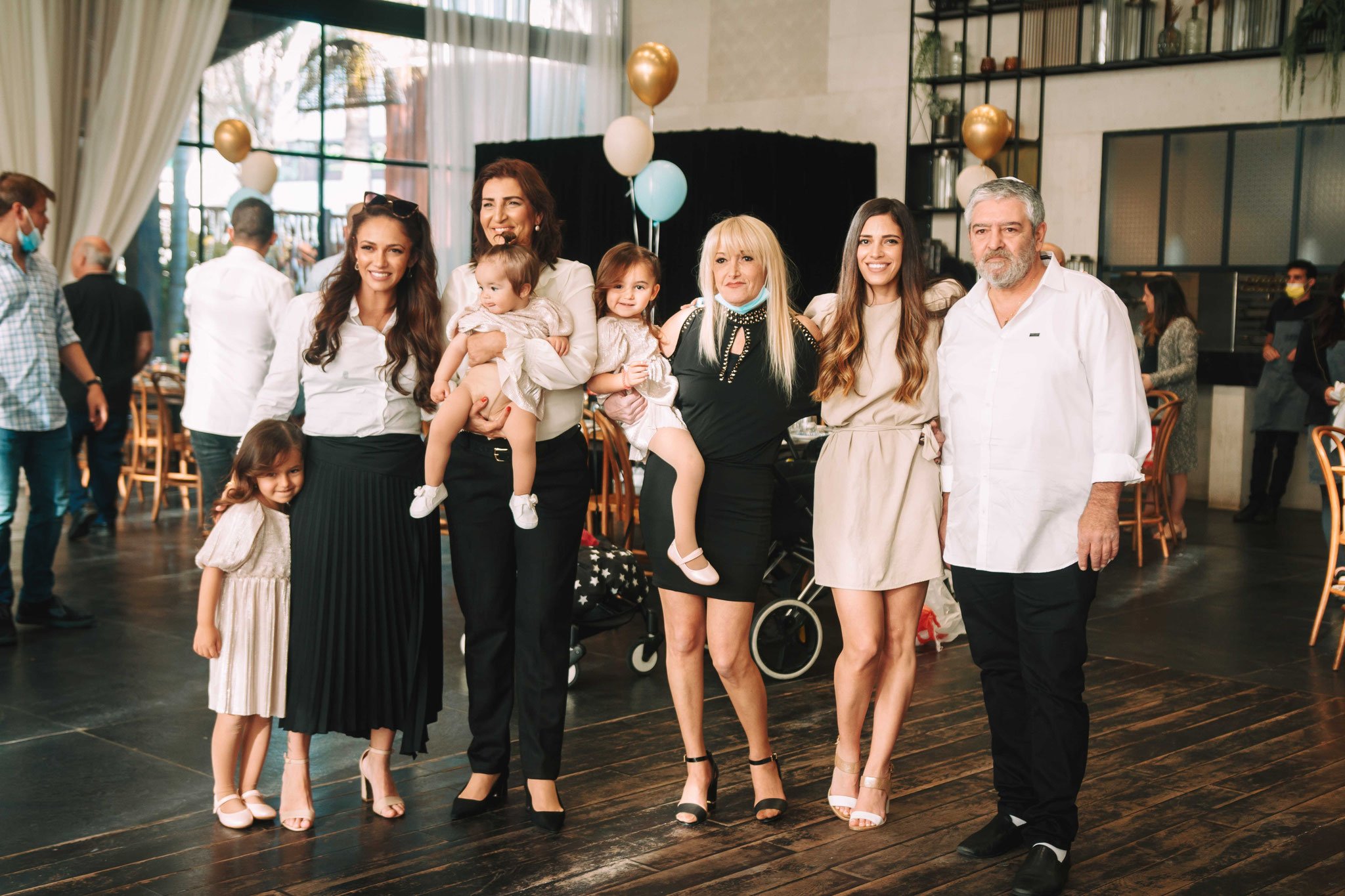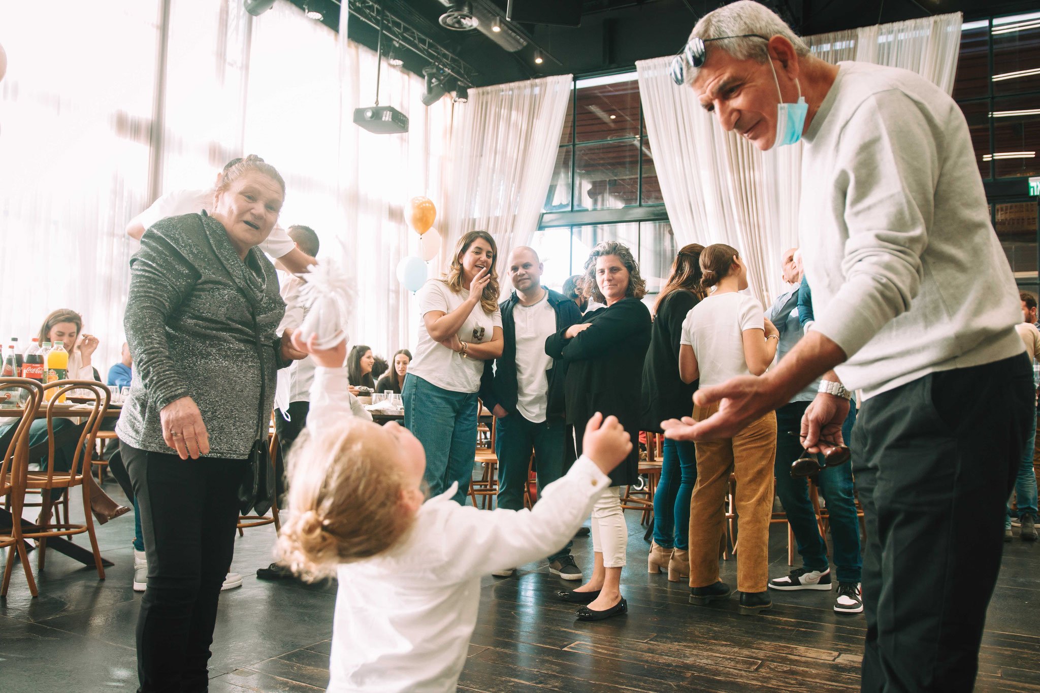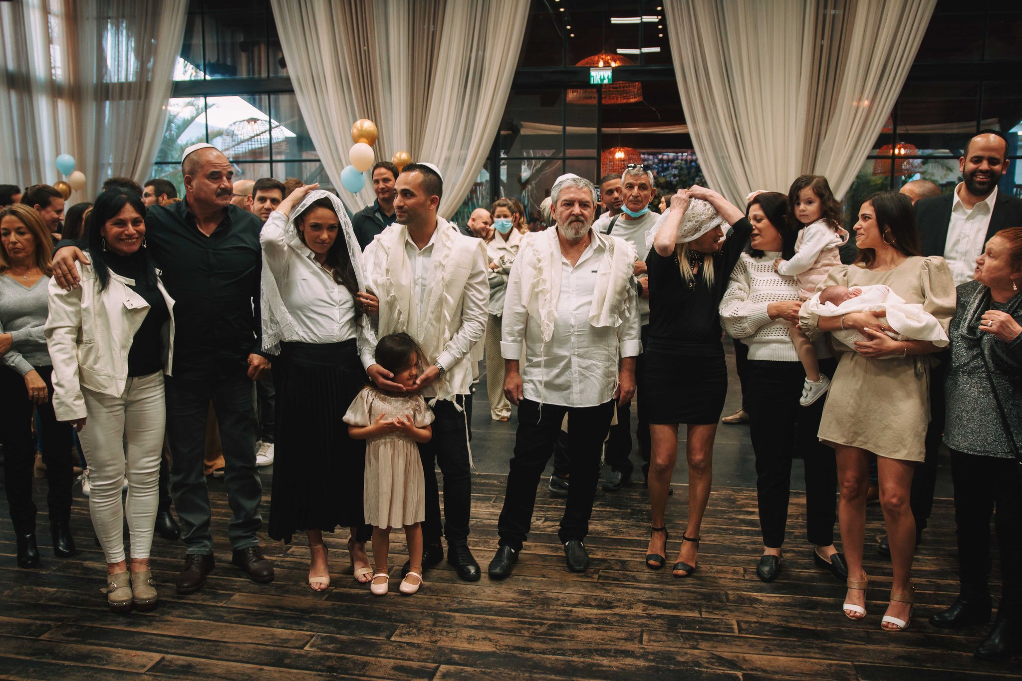 האווירה היא של בייחד, התרגשות מסוג אחר- המשפחה והאורחים לא ראו זה את זה זמן רב בשל הקורונה והסגרים שהיו. האורחים, המשפחה, מתוודעים מחדש זה לזה מחדש, מחליפים רשמים וחוויות, מתעניינים בשלומו של האחר. עם המסכות ככה מתחת לסנטר וחלקם עם מסיכות על הפנים, מתחבקים הם. הילדים מתכנסים במעגל ומתחבקים אחד עם השני, וכל זה במקום המהמם הזה, עם הבלונים והצמחייה המהממת שברקע. שימו לב לשער הבלונים המהמם, איך אפשר שלא להתרשם ממנו?, בכדי להמחיש את עוצמתו באתי בהיפוך ואחר כך ישר בצילום כאילו אני נכנס ועובר דרך השער, וזה בצמוד לאורחים הממשיכים להתוודע זה לזה וחלק עוד ממשיך להגיע