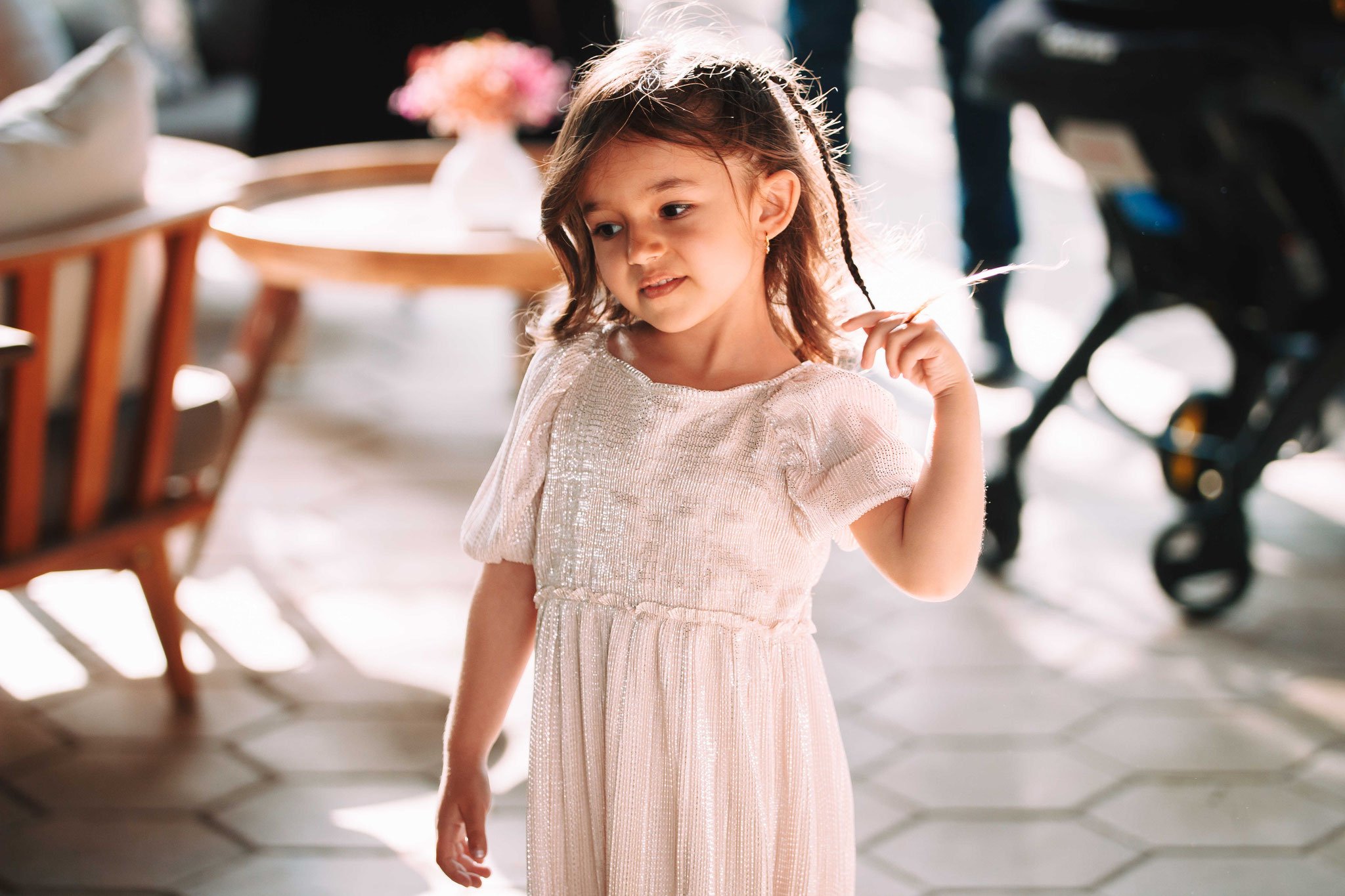 האווירה האוטופית הזו של המקום, בקבוקיי היין על השולחן האורחים הלבושים הייטב עם המשפחה, ההתרגשות האוחזת באנשים, הילדה שצילמתי איך היא נכנסת לאולם עם המבט המחויך שלה מזווית הרצפה. כל זה על מנת שכאשר תראו את הצילומים בשנים הבאות, לא תצטרכו להתאמץ בדמיונכם להרגיש את האווירה האוטופית המחשמלת הזו אלא זה יבוא לכם טבעי, לבד. איזה תענוג זה יהיה להורים שיהיו כבר סבא וסבתא להרגיש את כל זה מחדש, ולא רק להיזכר באירוע עצמו