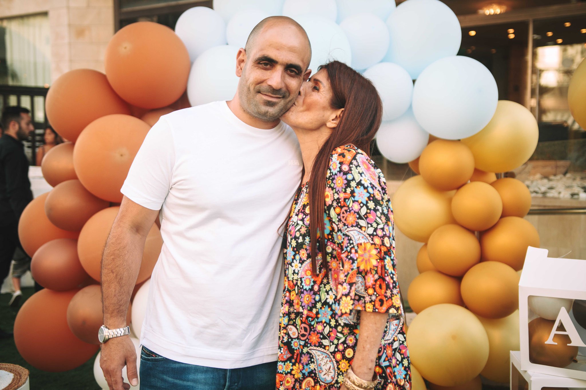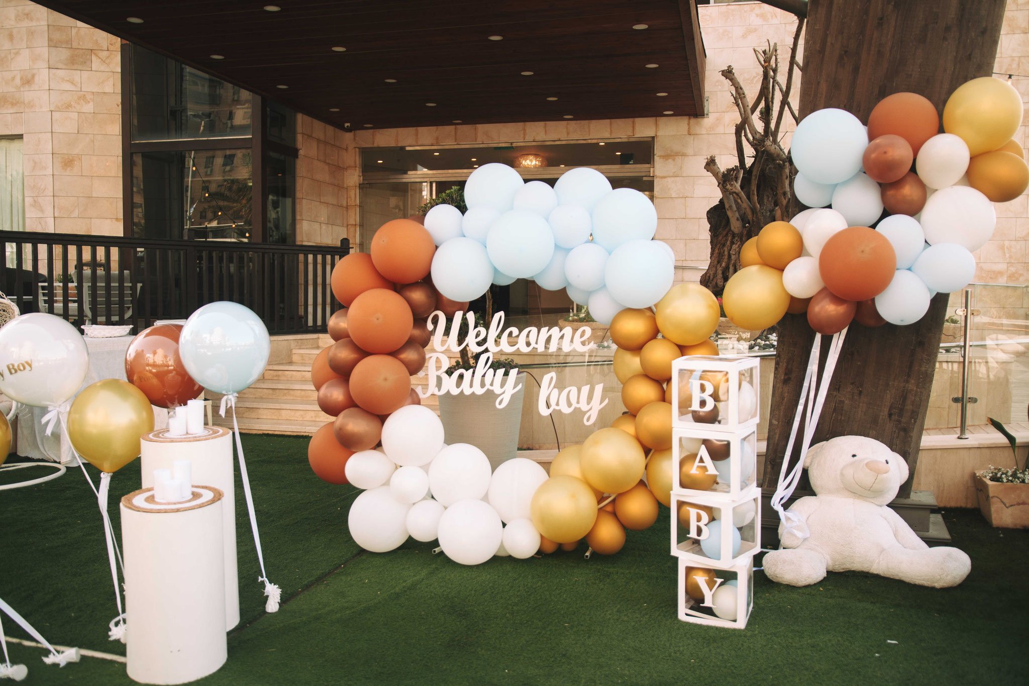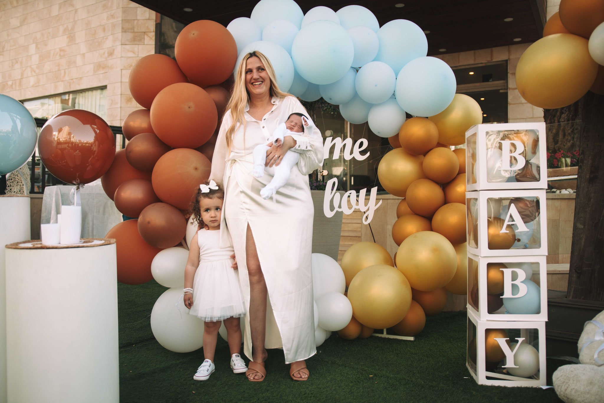 בברית מילה ישנם בלונים אך בברית המילה הזו ההשקעה היא מעל ומעבר. הבלונים בצבעי לבן, חום, זהב, קשורים ומחוברים זה בזה כזר מרהיב וססגוני הקשור לבובת דובי מקסימה שנשענת על עץ. בסמוך לו כשער בלונים מאותם הצבעים ועימו הכותרת המרשימה באנגלית "בייבי בוי" ועם קוביות שקופות שבתוכם הבלונים בנוי השם "בייבי". פינת התינוק הקסומה הזו עם כל תפאורת הבלונים המרהיבה והנהדרת כל כך הרשימה אותי שהייתי חייב לצלם זאת כמה וכמה פעמים. אבי האם הגיע עם אחת מבנותיו, מסיכתה על הסנטר, כתזכורת שהשמחה בצילה של הקורונה ועל כן זה אירוע מרגש אף יותר, כמה היינו בסגרים ובריחוק חברתי והינה מתחברים מחדש