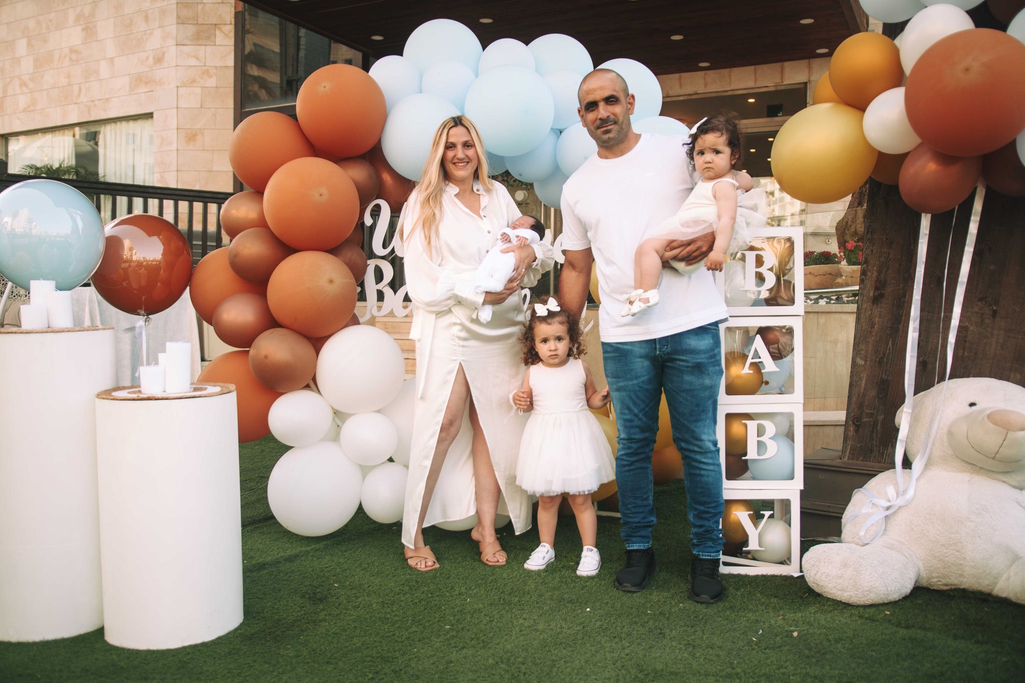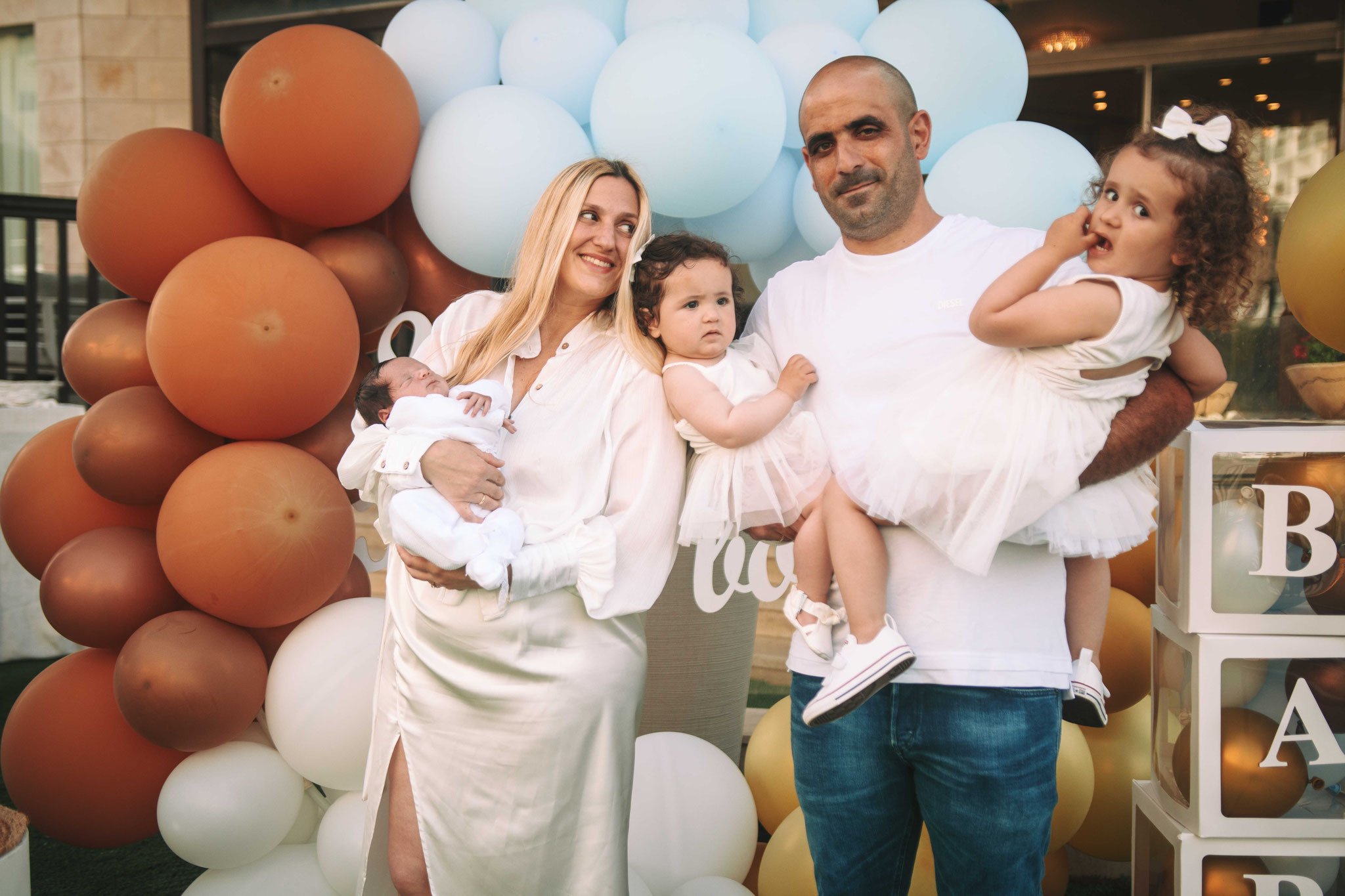האמא גם התרגשה מאוד מפינת הבלונים ובקשה להצטלם שם. היא לבושה חגיגי בלבן, אוחזת ברך הנולד, ביתה הלבושה לבן גם כן לידה ואני מצלם ונרגש בשבילם. האבא הצטרף לתמונה המשפחתית בעמדת הבלונים לתמונה משפחתית נהדרת. מרוב שזה מרגש החלטתי גם על צילום בשחור לבן, לתת לזה טאץ ייחודי