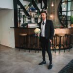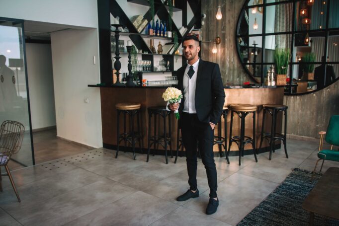 בחיר ליבה המאושר גם הוא בזמן החופשי שלו, עם חולצתו הלבנה המכופתרת והווסט האפור בשילוב עם כובע הבורדו