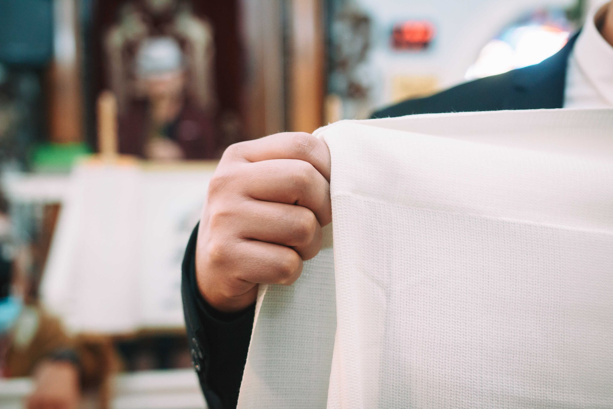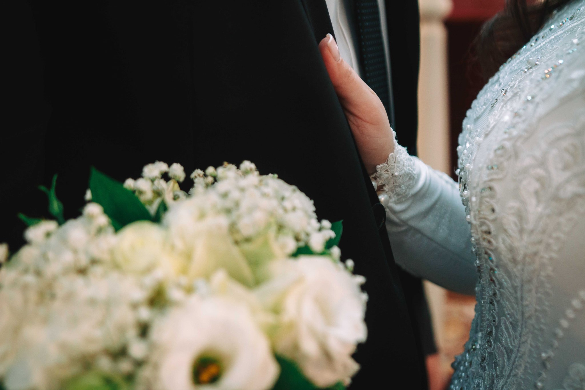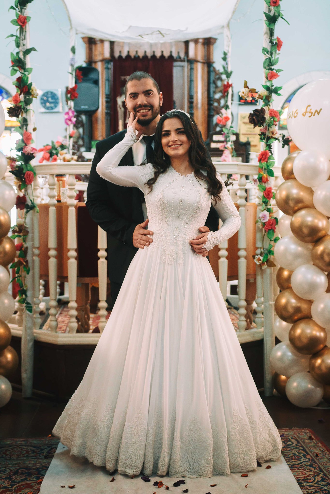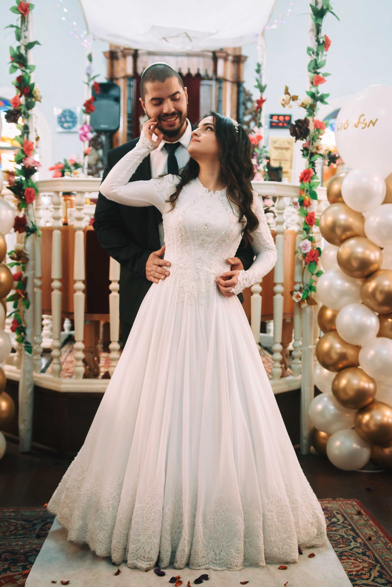 את החופה הלבנה בבית הכנסת הקיפו פרחים, בלונים בצבעים זהב לבן, והגג של החופה עצמו היה בד לבן עם עיטור של מגן דוד. לא היו צריכים להגזים עם הקישוטים בזכות המראה של בית הכנסת המהודר שהצליח בזכות עצמו להפוך את החתונה למרגשת ומיוחדת אף יותר. ההליכה לחופה התנהלה על גבי שטיח פרוס בצבע לבן עם עלי כותרת. החופה הייתה מלווה בנגן, ברב, והכל על פי הנחיות הקורונה. בית הכנסת היה מתאים לצילומים, יכולתי לצלם את האירוע מזוויות שונות כך שאפשר היה לראות את החתן והכלה מקרוב בגישה נוחה למדי, ממזיגת היין עד לשבירת הכוס. חתונה שמונה פחות משתתפים יוצאת מדויקת יותר בתמונות, יותר קל לשלוט בכמות המשתתפים בתמונה ואפילו ליצור תמונות משפחתיות מהממות